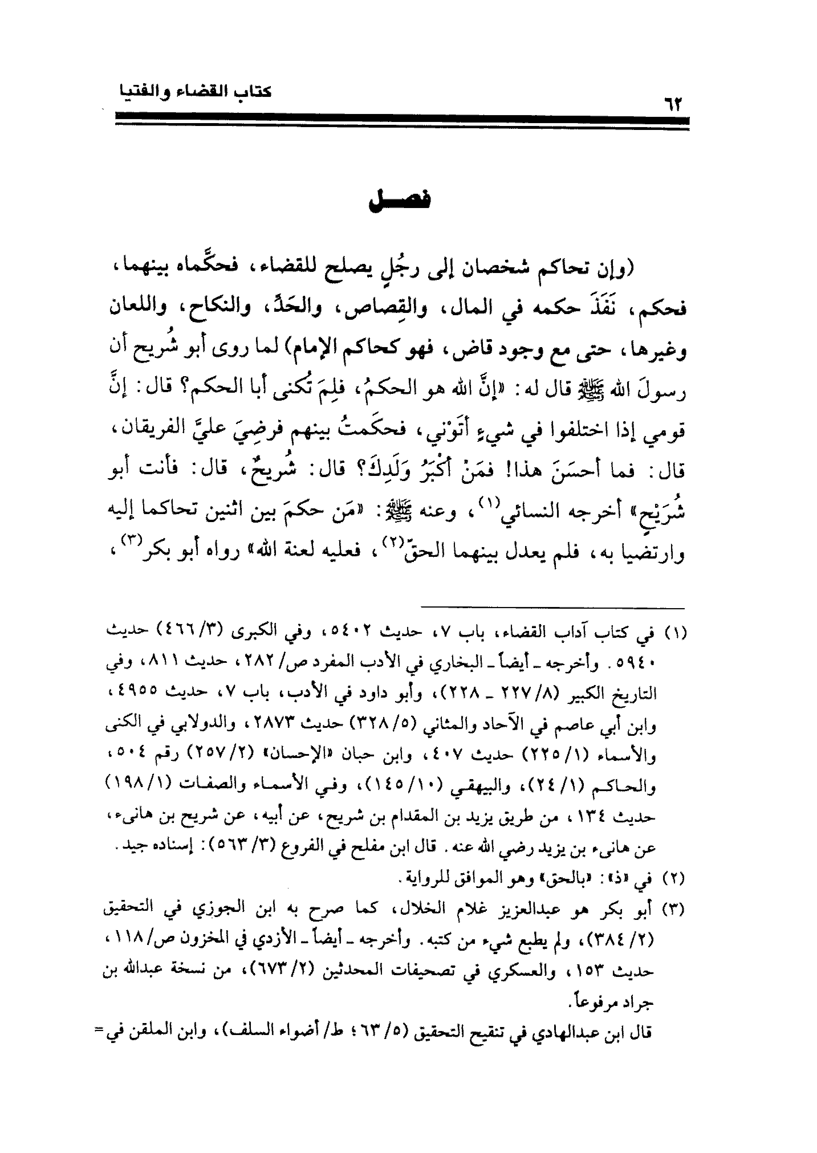 (وإن نحاكم شخصان إلى رجُلٍ يصلح للقضاء، فحكَّماه بينهما، فحكم، نَفَذَ حكمه في المال، والقِصاص، والحَدِّ، والنكاح، واللعان وغيرها، حتى مع وجود قاض، فهو كحاكم الإمام) لما روى أبو شُريح أن رسولَ الله - صلى الله عليه وسلم - قال له: "إنَّ الله هو الحكمُ، فلِمَ تُكنى أبا الحكم؟ قال: إنَّ قومي إذا اختلفوا في شيءٍ أتَوْني، فحكَمتُ بينهم فرضِيَ عليَّ الفريقان، قال: فما أحسَنَ هذا! فمَنْ أكْبَرُ وَلَدِكَ؟ قال: شُريحٌ، قال: فأنت أبو شُرَيْحٍ" أخرجه النسائي (¬١)، وعنه - صلى الله عليه وسلم -: "مَن حكمَ بين اثنين تحاكما إليه وارتضيا به، فلم يعدل بينهما الحقّ (¬٢)، فعليه لعنة الله" رواه أبو بكر (¬٣)،