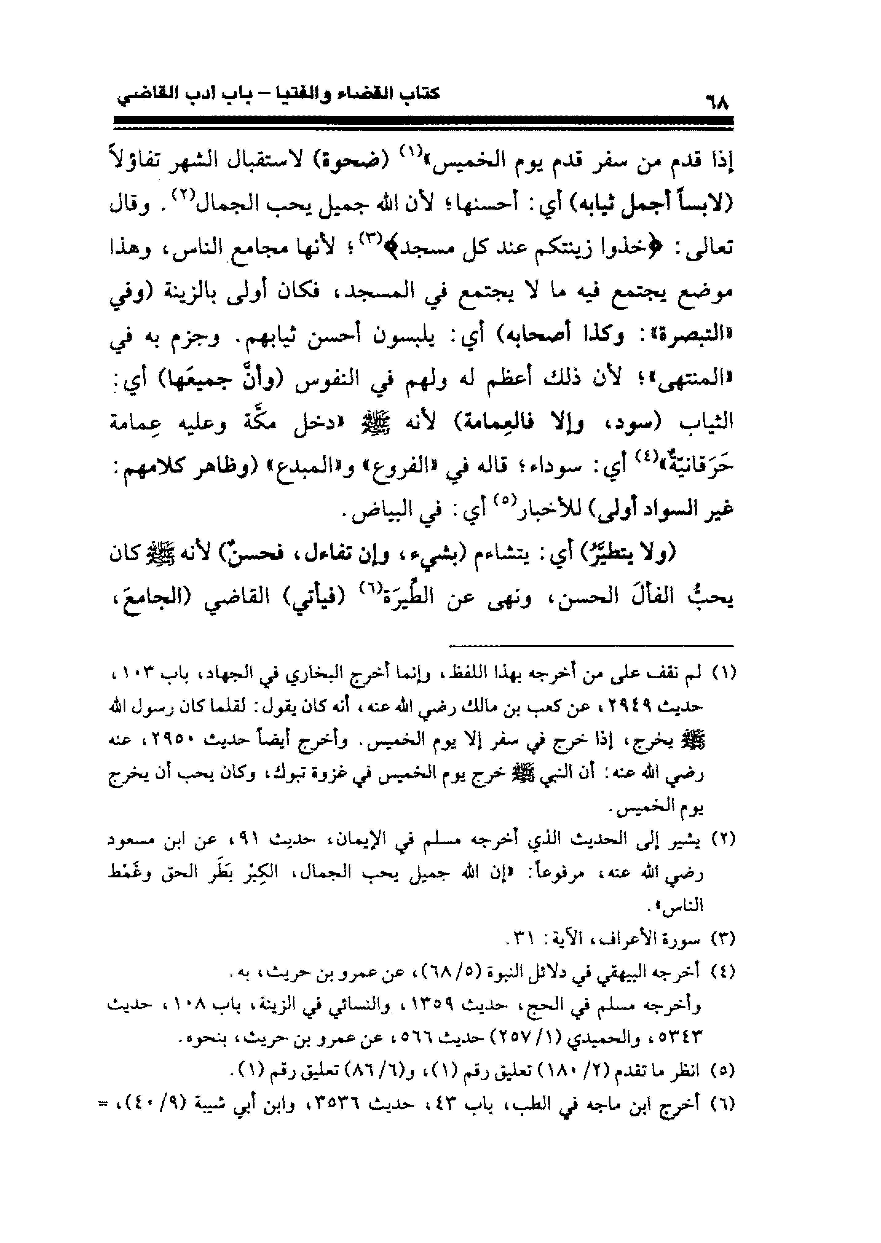 إذا قدم من سفر قدم يوم الخميس" (¬١) (ضحوة) لاستقبال الشهر تفاؤلًا (لابسًا أجمل ثيابه) أي: أحسنها؛ لأنَّ الله جميل يحب الجمال (¬٢). وقال تعالى: {خُذُوا زِينَتَكُمْ عِنْدَ كُلِّ مَسْجِدٍ} (¬٣)؛ لأنها مجامع الناس، وهذا موضع يجتمع فيه ما لا يجتمع في المسجد، فكان أولى بالزينة (وفي "التبصرة": وكذا أصحابه) أي: يلبسون أحسن ثيابهم. وجزم به في "المنتهى"؛ لأنَّ ذلك أعظم له ولهم في النفوس (وأنَّ جميعَها) أي: الثياب (سود، وإلا فالعِمامة) لأنه - صلى الله عليه وسلم - "دخل مكَّة وعليه عِمامة حَرَقانيّةٌ" (¬٤) أي: سوداء؛ قاله في "الفروع" و"المبدع" (وظاهر كلامهم: غير السواد أولى) للأخبار (¬٥) أي: في البياض.
