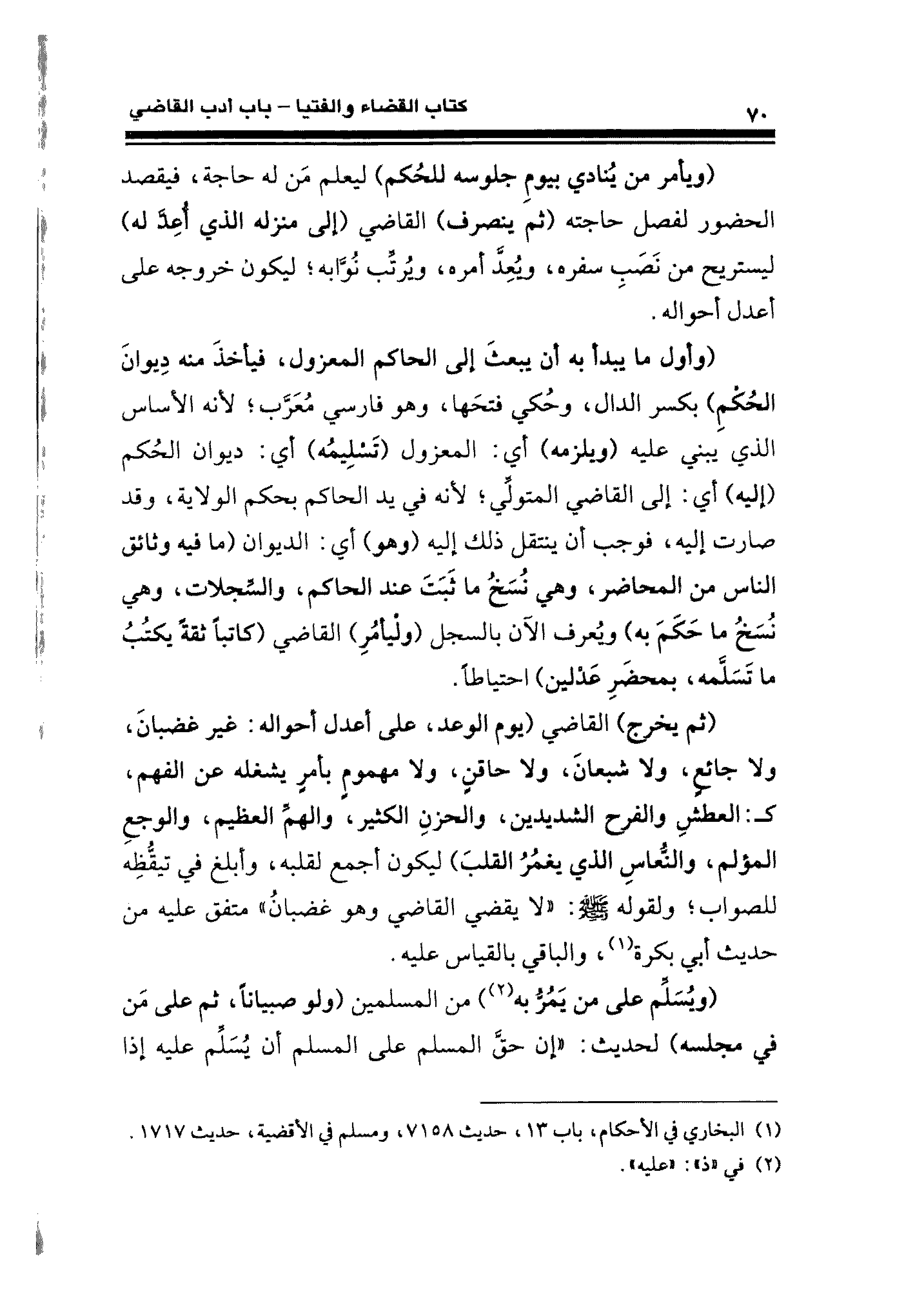 (ثمَّ يخرج) القاضي (يوم الوعد، على أعدل أحواله: غير غضبانَ، ولا جائعٍ، ولا شبعانَ، ولا حاقنٍ، ولا مهمومٍ بأمرٍ يشغله عن الفهم، كـ: العطشِ والفرح الشديدين، والحزنِ الكثير، والهمِّ العظيم، والوجعِ المؤلم، والنُّعاسِ الذي يغمُرُ القلبَ) ليكون أجمع لقلبه، وأبلغ في تيقُّظه للصواب؛ ولقوله - صلى الله عليه وسلم -: "لا يقضي القاضي وهو غضبانُ" متفق عليه من حديث أبي بكرة (¬١)، والباقي بالقياس عليه.