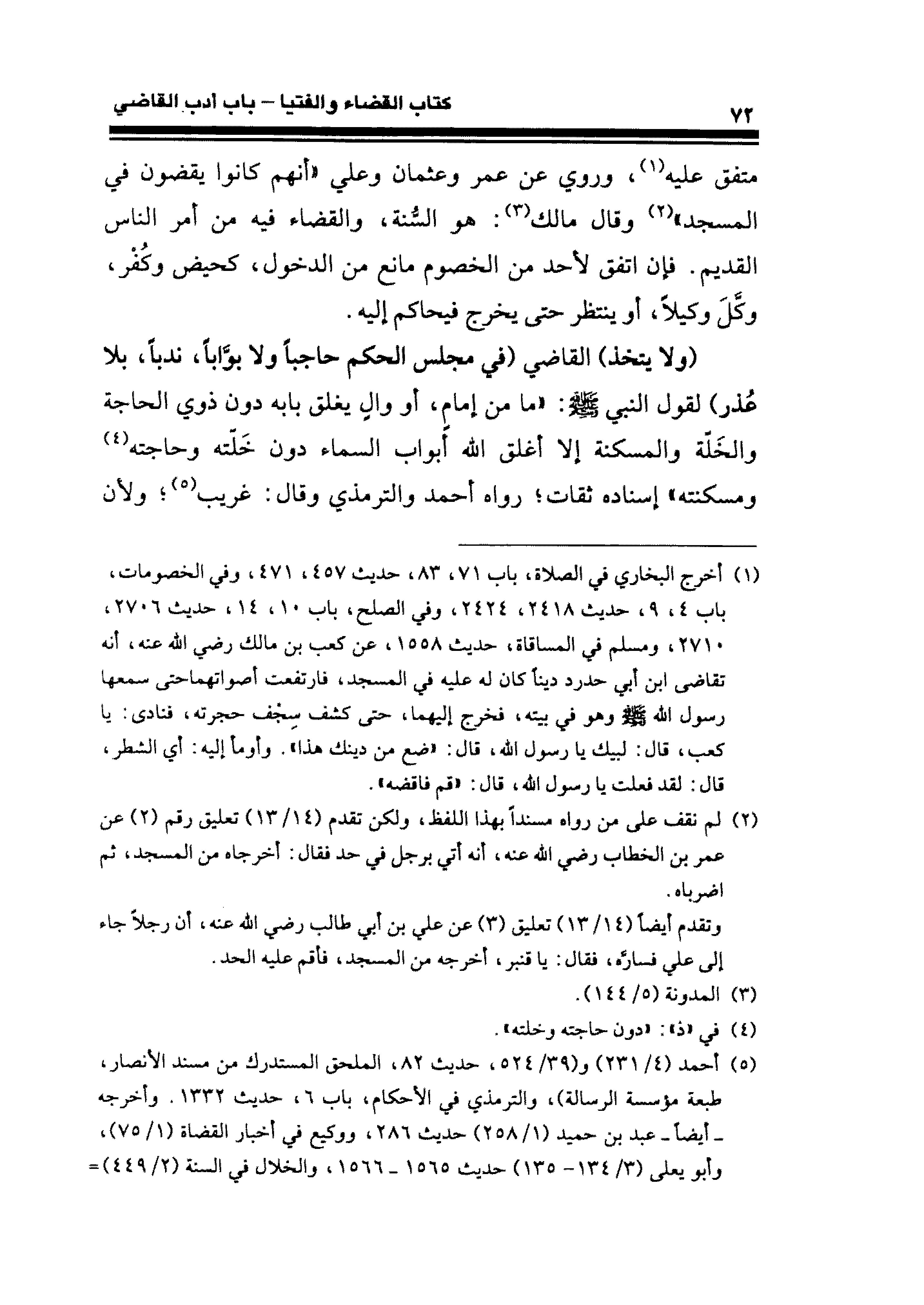 (ولا يتخذ) القاضي (في مجلس الحكم حاجبًا ولا بوابًا، ندبًا، بلا عُذر) لقول النبي - صلى الله عليه وسلم -: "ما من إمام، أو والٍ يغلق بابه دون ذوي الحاجة والخَلة والمسكنة إلَّا أغلق الله أَبواب السماء دون خلته وحاجته (¬٤) ومسكنته" إسناده ثقات؛ رواه أحمد والترمذي وقال: غريب (¬٥)؛ ولأن