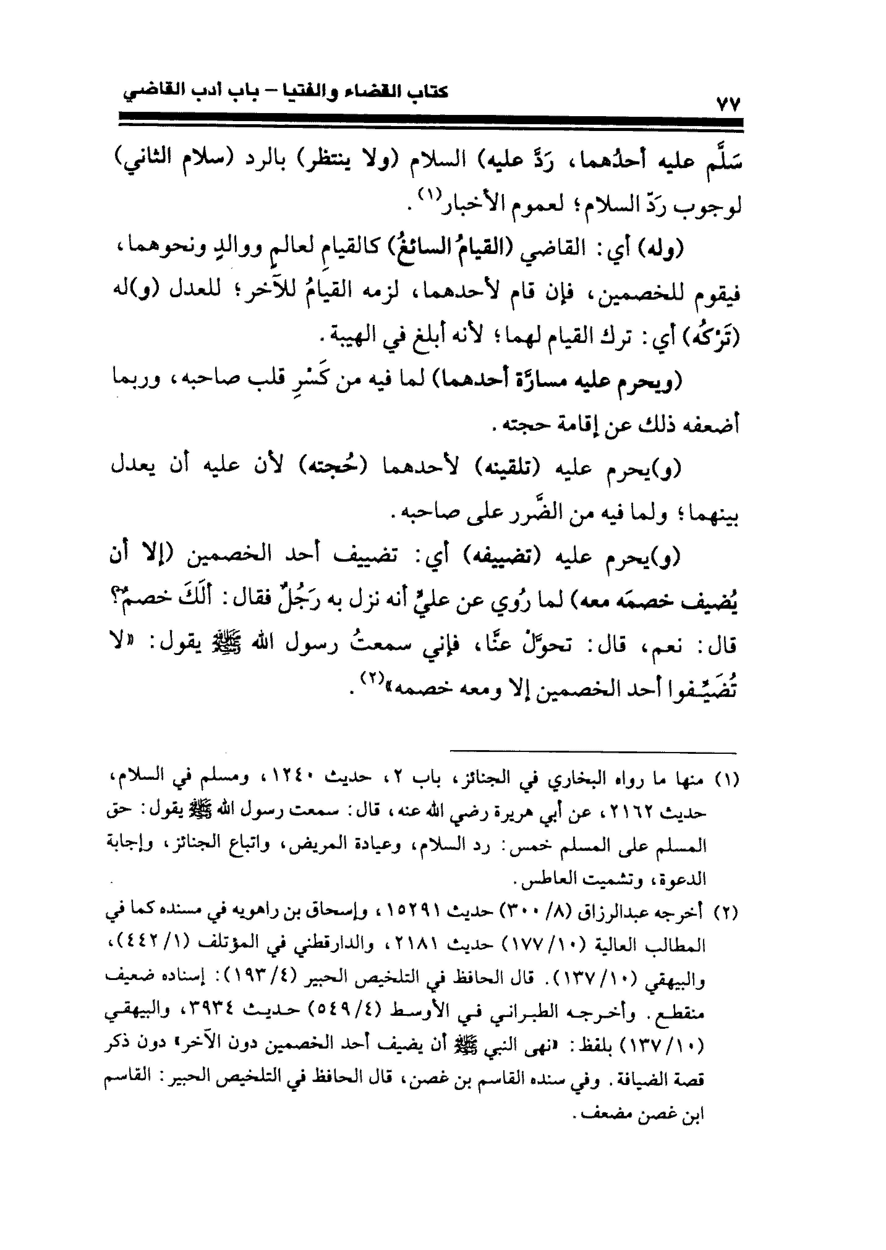 (¬٢) أخرجه عبد الرَّزاق (٨/ ٣٠٠) حديث ١٥٢٩١، وإسحاق بن راهويه في مسنده كما في المطالب العالية (١٠/ ١٧٧) حديث ٢١٨١، والدارقطني في المؤتلف (١/ ٤٤٢)، والبيهقيّ (١٠/ ١٣٧). قال الحافظ في التلخيص الحبير (٤/ ١٩٣): إسناده ضعيف منقطع. وأخرجه الطبراني في الأوسط (٤/ ٥٤٩) حديث ٣٩٣٤، والبيهقيّ (١٠/ ١٣٧) بلفظ: "نهى النَّبيّ - صَلَّى الله عليه وسلم - أن يضيف أحد الخصمين دون الآخر" دون ذكر قصة الضيافة وفي سنده القاسم بن غصن، قال الحافظ في التلخيص الحبير القاسم ابن عصر مضعف.