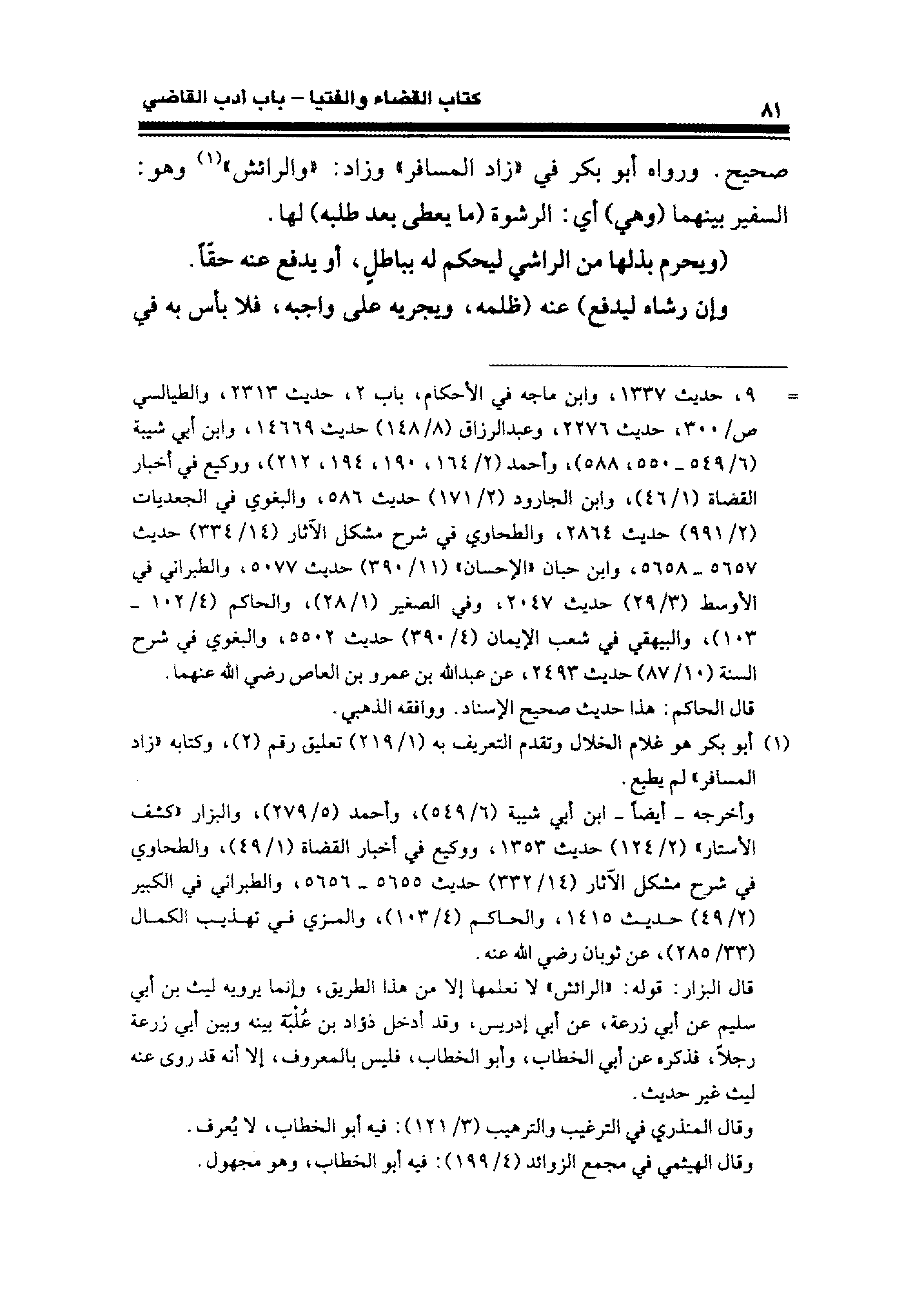صحيح. ورواه أبو بكر في "زاد المسافر" وزاد: "والرائش" (¬١) وهو: السفير بينهما (وهي) أي: الرشرة (ما يعطى بعد طلبه) لها.