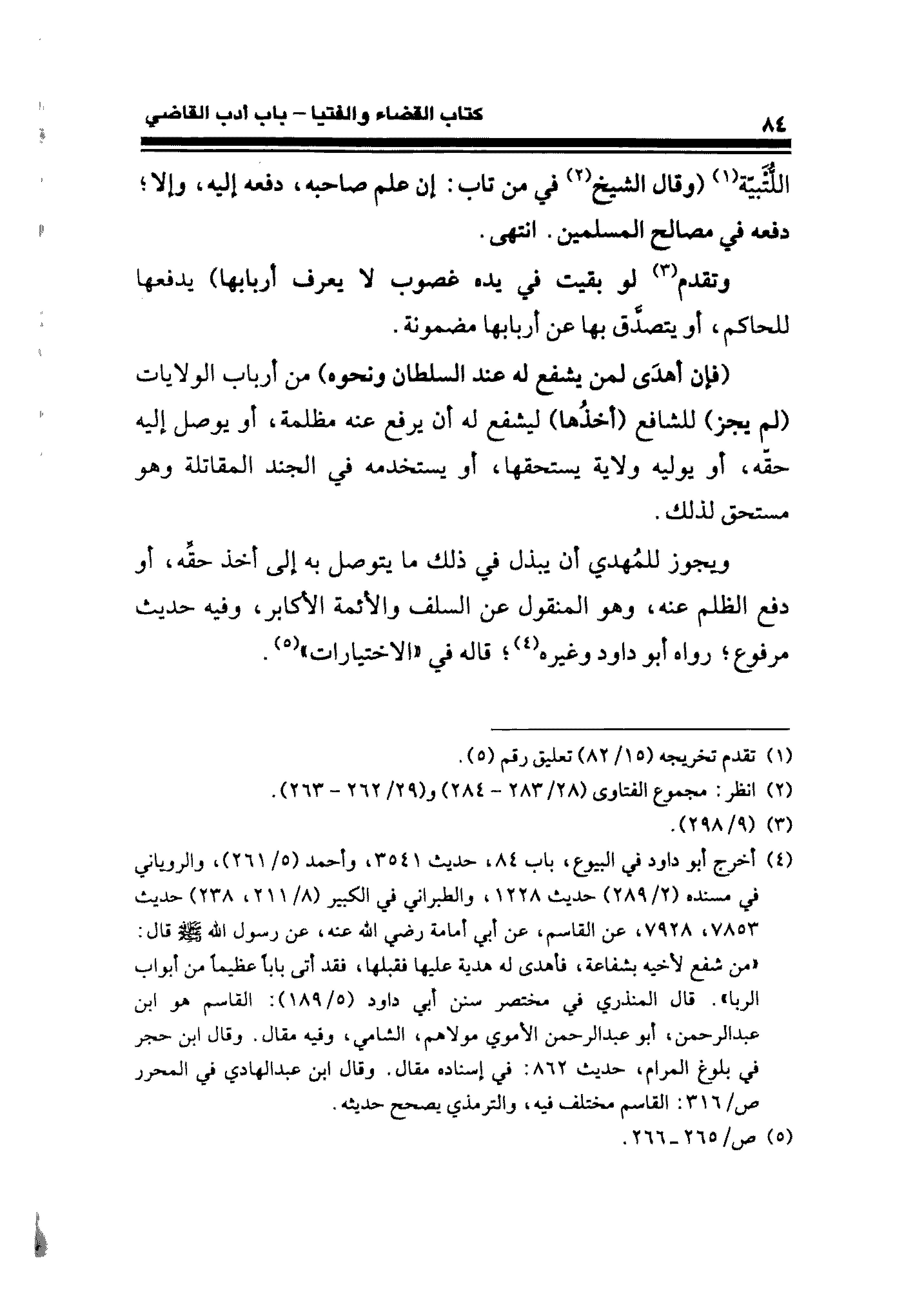 (¬٤) أخرج أبو داود فِي البيوع، باب ٨٤، حديث ٣٥٤١، وأَحمد (٥/ ٢٦١)، والروياني في مسنده (٢/ ٢٨٩) حديث ١٢٢٨، والطبراني في الكبير (٨/ ٢١١؛ ٢٣٨) حديث ٧٨٥٣، ٧٩٢٨، عن القاسم، عن أبي أمامة رضي الله عنه، عن رسول الله - صلى الله عليه وسلم - قال: "من شفع لأخيه بشفاعة، فأهدى له هدية عليها فقبلها، فقد أتى بابًا عظيمًا من أبواب الربا". قال المنذري فِي مختصر سنن أبي داود (٥/ ١٨٩): القاسم هو ابن عبد الرحمن، أبو عبد الرحمن الأموي مولاهم، الشامي؛ وفيه مقال: وقال ابن حجر في بلوغ المرام، حديث ٨٦٢: في إسناده مقال: وقال ابن عبد الهادي فِي المحرر ص/ ٣١٦: القاسم مختلف فيه، والترمذي يصحح حديثه