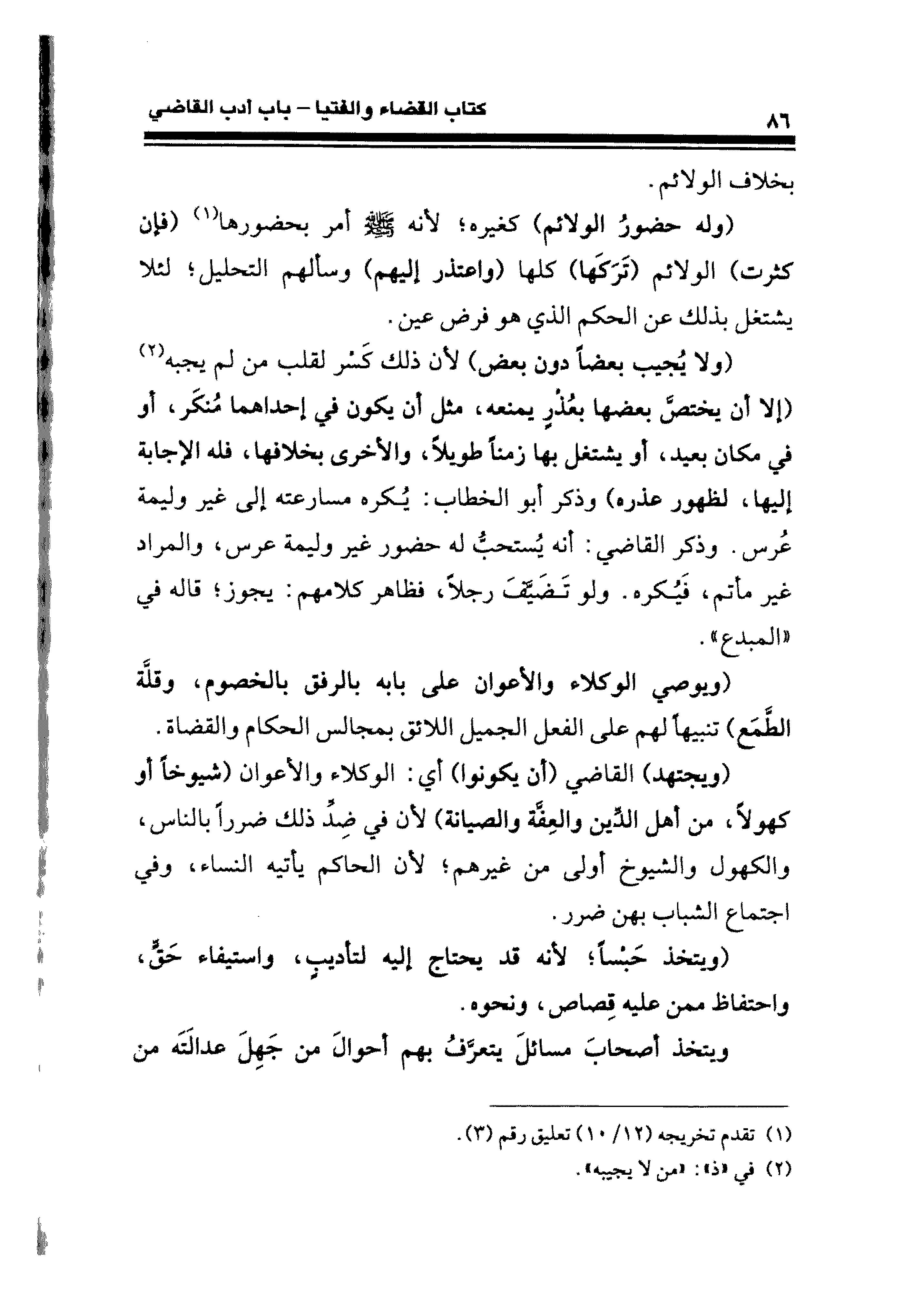 (وله حضورُ الولائم) كغيره؛ لأنه - صلى الله عليه وسلم - أمر بحضورها (¬١) (فإن كثرت) الولائم (تَرَكَها) كلها (واعتذر إليهم) وسألهم التحليل؛ لئلا يشتغل بذلك عن الحكم الذي هو فرض عين.