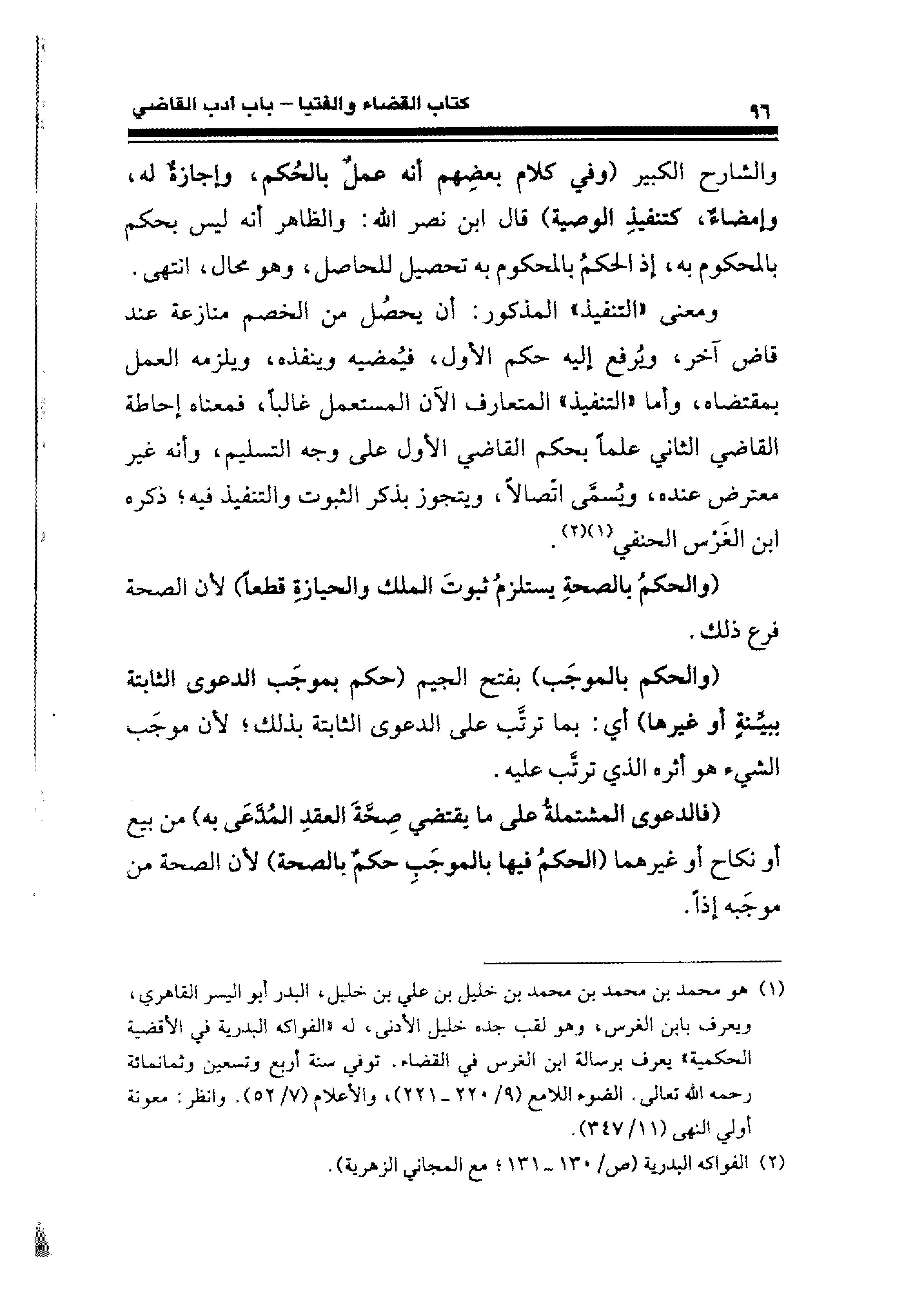 والشارح الكبير (وفي كلام بعضِهم أنَّه عملٌ بالحُكم، وإجازةٌ له، وإمضاءٌ، كتنفيذِ الوصية) قال ابن نصر الله: والظاهر أنَّه ليس بحكم بالمحكوم به، إذ الحكمُ بالمحكوم به تحصيل للحاصل، وهو محال، انتهى.
