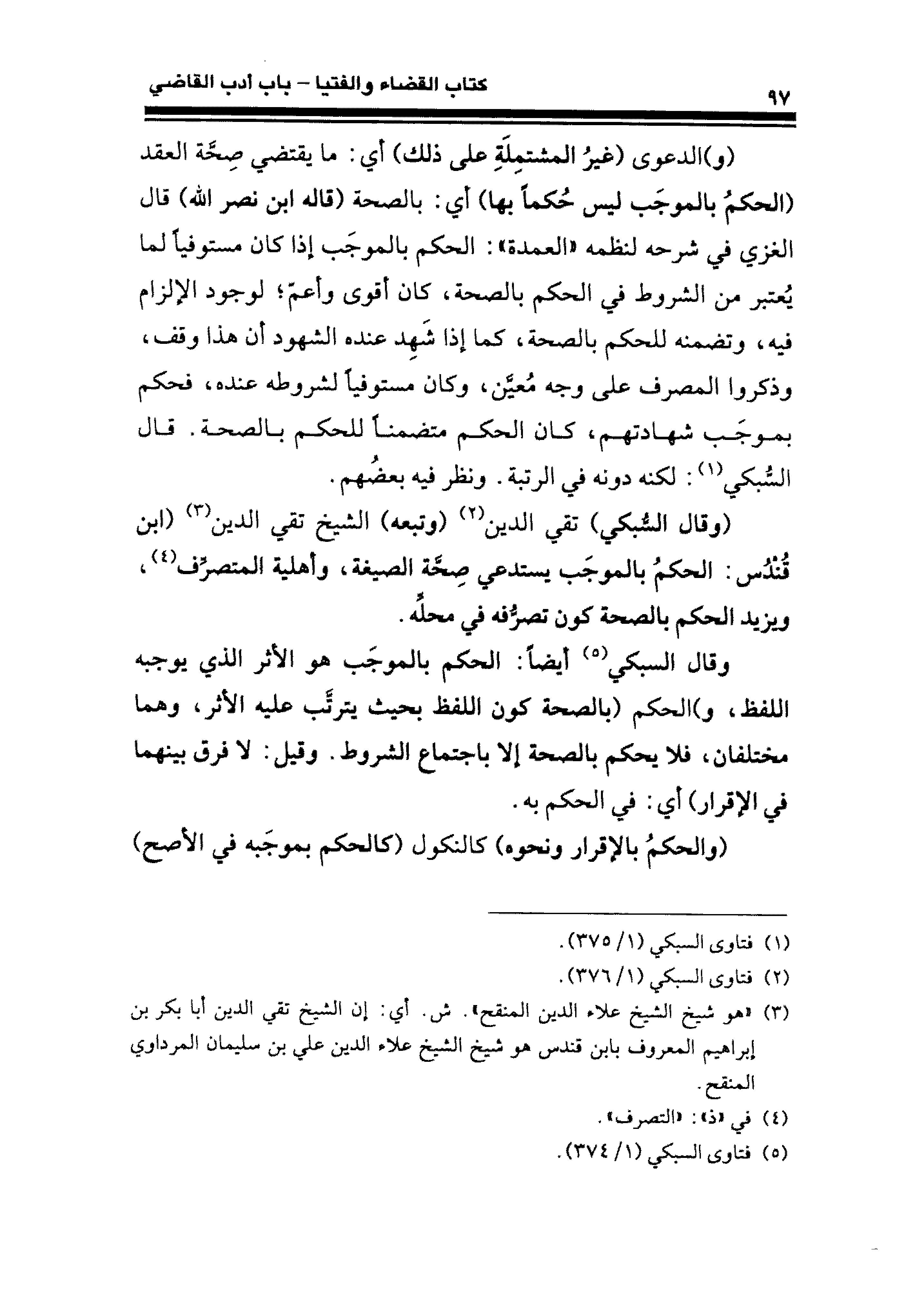 (و) الدعوى (غيرُ المشتمِلَةِ على ذلك) أي: ما يقتضي صِحَّة العقد (الحكمُ بالموجب ليس حُكمًا بها) أي: بالصحة (قاله ابن نصر الله) قال الغزي في شرحه لنظمه "العمدة": الحكم بالموجَب إذا كان مستوفيًا لما يُعتبر من الشروط في الحكم بالصحة، كان أقوى وأعمّ؛ لوجود الإلزام فيه، وتضمنه للحكم بالصحة، كما إذا شَهِد عنده الشهود أن هذا وقف، وذكروا المصرف على وجه مُعيَّن، وكان مستوفيًا لشروطه عنده، فحكم بموجَب شهادتهم، كان الحكم متضمنًا للحكم بالصحة. قال السُّبكي (¬١)؛ لكنه دونه في الرتبة. ونظر فيه بعضُهم.