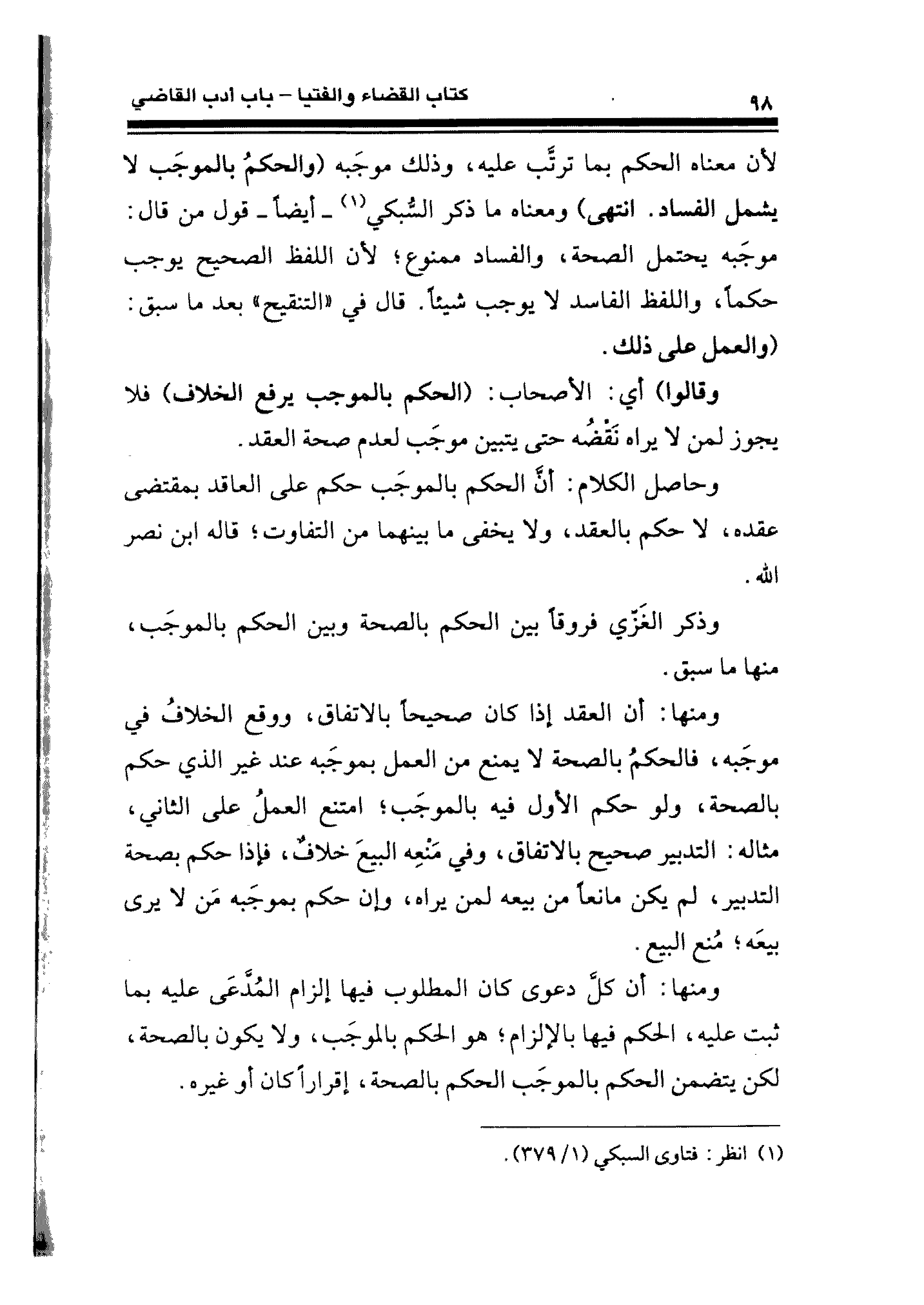وذكر الغَزّي فروقًا بين الحكم بالصحة وبين الحكم بالموجَب، منها ما سبق.