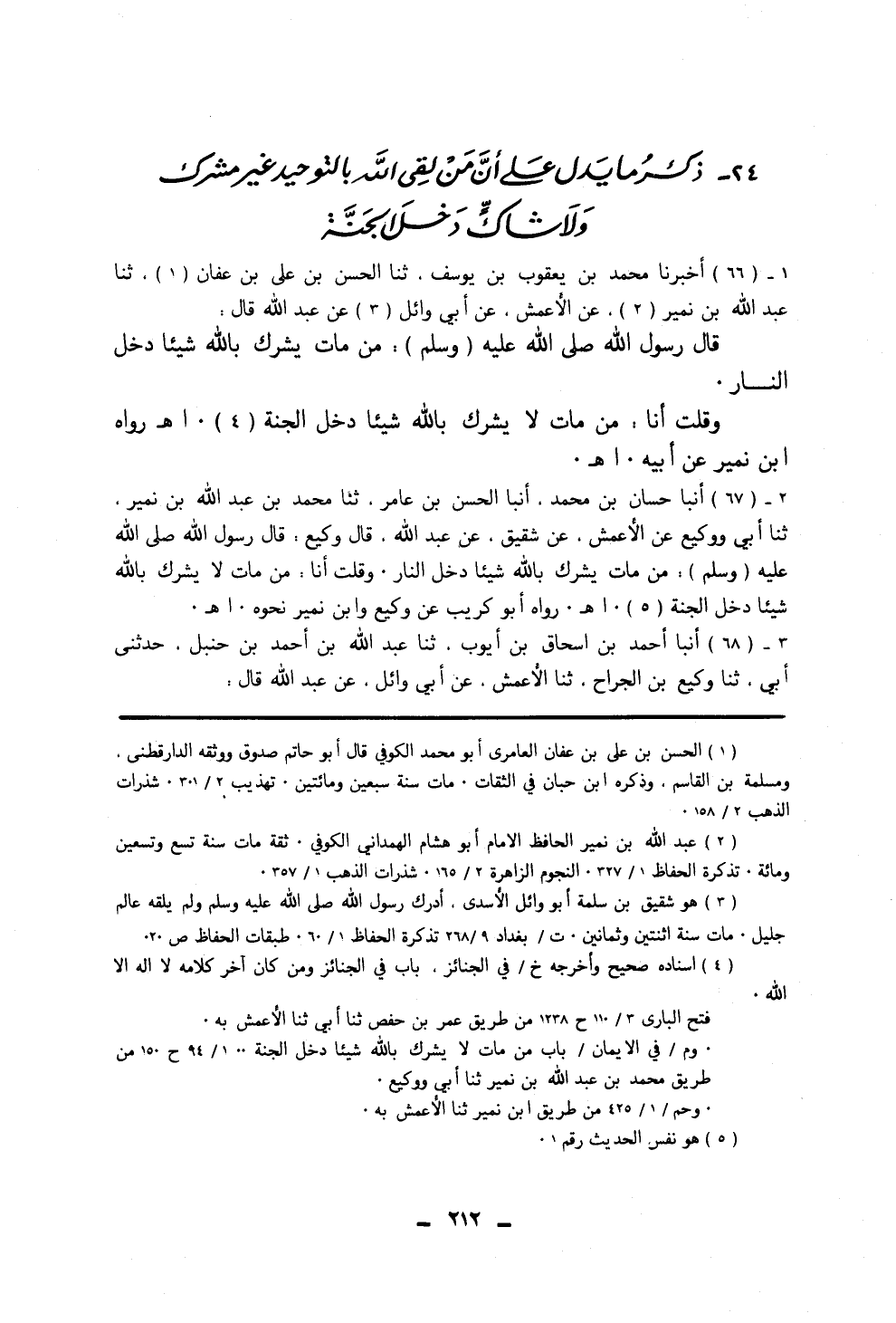 ٦٧ - أَنْبَأَ حَسَّانُ بْنُ مُحَمَّدٍ، أَنْبَأَ الْحَسَنُ بْنُ عَامِرٍ، ثَنَا مُحَمَّدُ بْنُ عَبْدِ اللَّهِ بْنِ نُمَيْرٍ، ثَنَا أَبِي، وَوَكِيعٌ، عَنِ الْأَعْمَشِ، عَنْ شَقِيقٍ، عَنْ عَبْدِ اللَّهِ، قَالَ وَكِيعٌ: قَالَ رَسُولُ اللَّهِ صَلَّى اللهُ عَلَيْهِ وَسَلَّمَ: «مَنْ مَاتَ يُشْرِكُ بِاللَّهِ شَيْئًا دَخَلَ النَّارَ» . وَقُلْتُ أَنَا: «منْ مَاتَ لَا يُشْرِكُ بِاللَّهِ شَيْئًا دَخَلَ الْجَنَّةَ» . رَوَاهُ أَبُو كُرَيْبٍ، عَنْ وَكِيعٍ، وَابْنِ نُمَيْرٍ نَحْوَهُ
