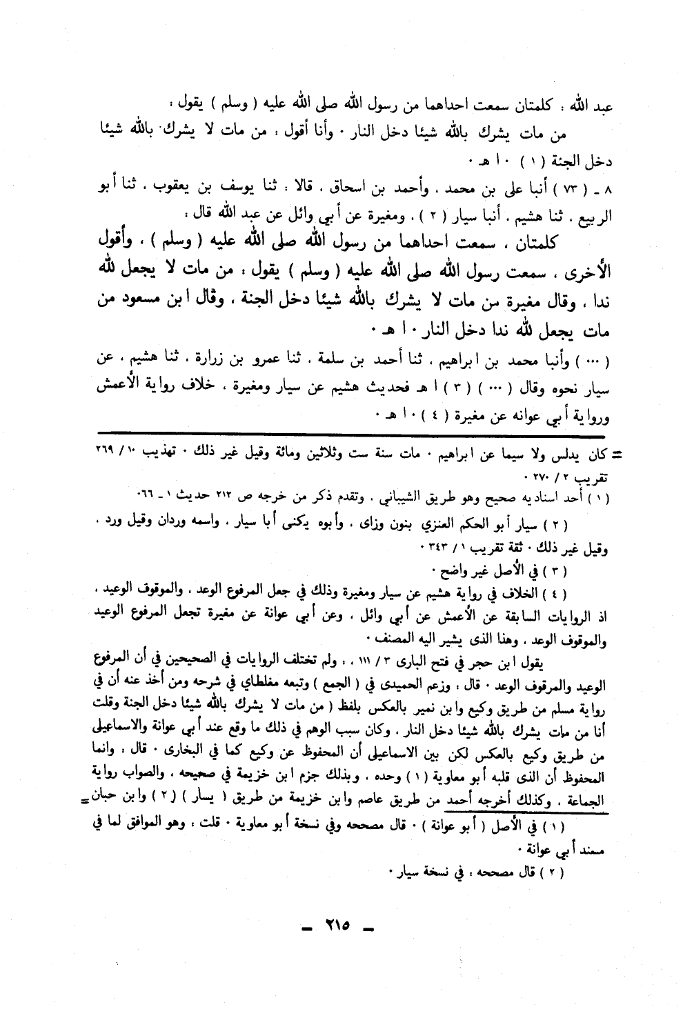 ٧٣ - أَنْبَأَ عَلِيُّ بْنُ مُحَمَّدٍ، وَأَحْمَدُ بْنُ إِسْحَاقَ، قَالَا: ثَنَا يُوسُفُ بْنُ يَعْقُوبَ، ثَنَا أَبُو الرَّبِيعِ، ثَنَا هُشَيْمٌ، أَنْبَأَ سَيَّارٌ، وَمُغِيرَةُ، عَنْ أَبِي وَائِلٍ، عَنْ عَبْدِ اللَّهِ، قَالَ: كَلِمَتَانِ سَمِعْتُ إِحْدَاهُمَا مِنْ رَسُولِ اللَّهِ صَلَّى اللهُ عَلَيْهِ وَسَلَّمَ وَأَقُولُ الْأُخْرَى، سَمِعْتُ رَسُولَ اللَّهِ صَلَّى اللهُ عَلَيْهِ وَسَلَّمَ يَقُولُ: «مَنْ مَاتَ لَا يَجْعَلُ لِلَّهِ نِدًّا» وَقَالَ مُغِيرَةُ: «مَنْ مَاتَ لَا يُشْرِكُ بِاللَّهِ شَيْئًا، دَخَلَ الْجَنَّةَ» . وَقَالَ ابْنُ مَسْعُودٍ: «مَنْ مَاتَ يَجْعَلُ لِلَّهِ نِدًّا دَخَلَ النَّارَ» . وَأَنْبَأَ مُحَمَّدُ بْنُ إِبْرَاهِيمَ، ثَنَا أَحْمَدُ بْنُ سَلَمَةَ، ثَنَا عَمْرُو بْنُ زُرَارَةَ، ثَنَا هُشَيْمٌ، عَنْ سَيَّارٍ نَحْوَهُ، وَقَالَ: «فَحَدِيثُ هُشَيْمٍ عَنْ سَيَّارٍ، وَمُغِيرَةَ خِلَافُ رِوَايَةِ الْأَعْمَشِ وَرِوَايَةِ أَبِي عَوَانَةَ عَنْ مُغِيرَةَ»