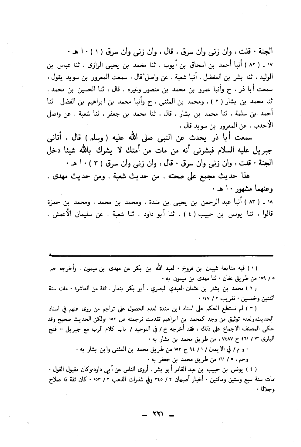 ٨٢ - أَنْبَأَ أَحْمَدُ بْنُ إِسْحَاقَ بْنِ أَيُّوبَ، ثَنَا مُحَمَّدُ بْنُ يَحْيَى الرَّازِيُّ، ثَنَا عَبَّاسُ بْنُ الْوَلِيدِ، ثَنَا بِشْرُ بْنُ الْمُفَضَّلِ، أَنْبَأَ شُعْبَةُ، عَنْ وَاصِلٍ، قَالَ: سَمِعْتُ الْمَعْرُورَ بْنَ سُوَيْدٍ، يَقُولُ: سَمِعْتُ أَبَا ذَرٍّ، ح وَأَنْبَأَ عَمْرُو بْنُ مُحَمَّدِ بْنِ مَنْصُورٍ وَغَيْرُهُ قَالَ: ثَنَا الْحُسَيْنُ بْنُ مُحَمَّدٍ، ثَنَا مُحَمَّدُ بْنُ بَشَّارٍ، وَمُحَمَّدُ بْنُ الْمُثَنَّى، ح، وَأَنْبَأَ مُحَمَّدُ بْنُ إِبْرَاهِيمَ بْنِ الْفَضْلِ، ثَنَا أَحْمَدُ بْنُ سَلَمَةَ، ثَنَا مُحَمَّدُ بْنُ بَشَّارٍ، قَالَ: ثَنَا مُحَمَّدُ بْنُ جَعْفَرٍ، ثَنَا شُعْبَةُ، عَنْ وَاصِلٍ الْأَحْدَبِ، عَنِ الْمَعْرُورِ بْنِ سُوَيْدٍ، قَالَ: سَمِعْتُ أَبَا ذَرٍّ، يُحَدِّثُ عَنِ النَّبِيِّ صَلَّى اللهُ عَلَيْهِ وَسَلَّمَ، قَالَ: " أَتَانِي جِبْرِيلُ عَلَيْهِ السَّلَامُ فَبَشَّرَنِي أَنَّهُ مَنْ مَاتَ مِنْ أُمَّتِكَ لَا يُشْرِكُ بِاللَّهِ شَيْئًا دَخَلَ الْجَنَّةَ، قُلْتُ: وَإِنْ زَنَى وَإِنْ سَرَقَ، قَالَ: وَإِنْ زَنَى وَإِنْ سَرَقَ «هَذَا حَدِيثٌ مُجْمَعٌ عَلَى صِحَّتِهِ مِنْ حَدِيثِ شُعْبَةَ، وَمِنْ حَدِيثِ مَهْدِيٍّ وَعَنْهُمَا مَشْهُورٌ»