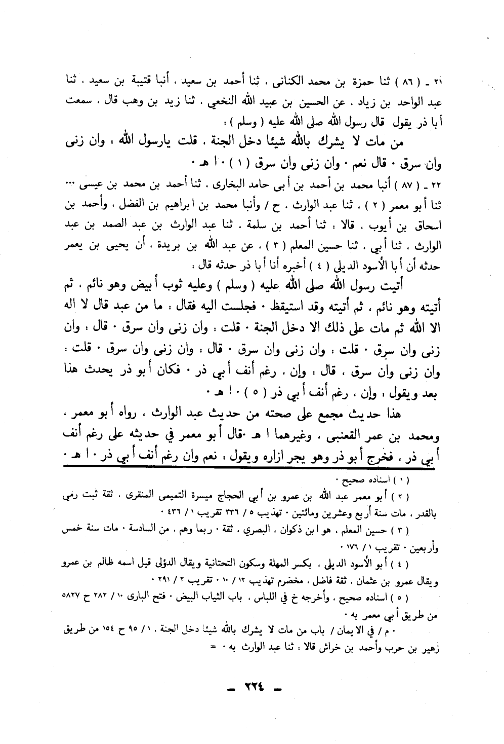 ٨٦ - ثَنَا حَمْزَةُ بْنُ مُحَمَّدٍ الْكِنَانِيُّ، ثَنَا أَحْمَدُ بْنُ سَعِيدٍ، أَنْبَأَ قُتَيْبَةُ بْنُ سَعِيدٍ، ثَنَا عَبْدُ الْوَاحِدِ بْنُ زِيَادٍ، عَنِ الْحُسَيْنِ بْنِ عُبَيْدِ اللَّهِ النَّخَعِيُّ، ثَنَا زَيْدُ بْنُ وَهْبٍ، قَالَ: سَمِعْتُ أَبَا ذَرٍّ، يَقُولُ: قَالَ رَسُولُ اللَّهِ صَلَّى اللهُ عَلَيْهِ وَسَلَّمَ: «مَنْ مَاتَ لَا يُشْرِكُ بِاللَّهِ شَيْئًا دَخَلَ الْجَنَّةَ» ، قُلْتُ: يَا رَسُولَ اللَّهِ وَإِنْ زَنَى وَإِنْ سَرَقَ، قَالَ: «نَعَمْ وَإِنْ زَنَى وَإِنْ سَرَقَ»