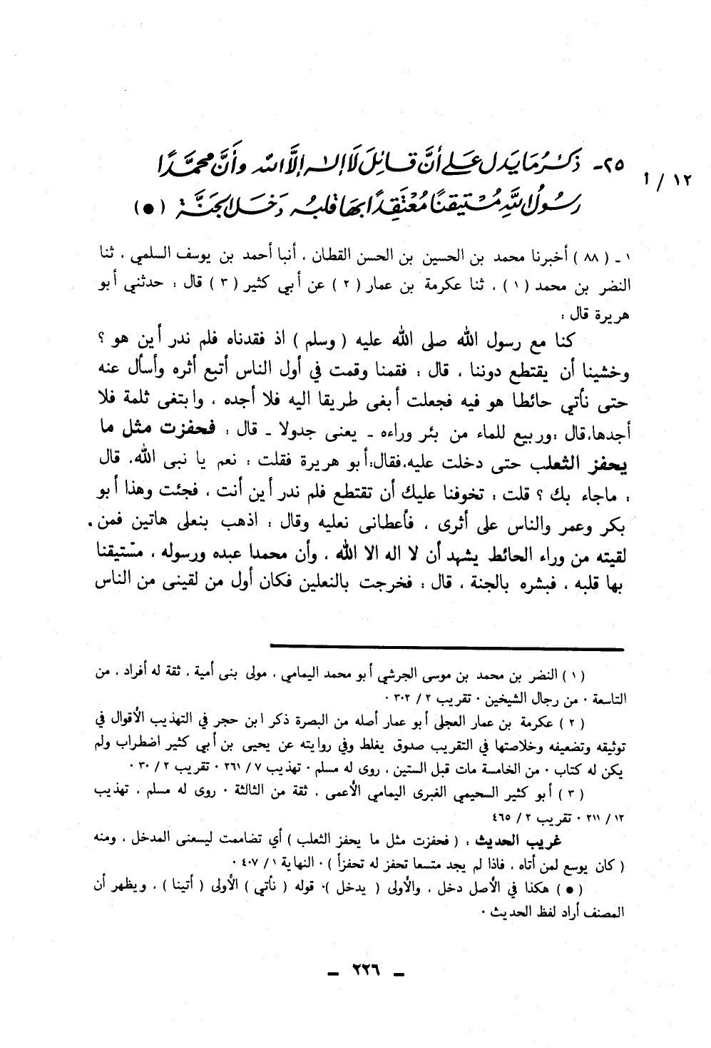 ٨٨ - أَخْبَرَنَا مُحَمَّدُ بْنُ الْحُسَيْنِ بْنِ الْحَسَنِ الْقَطَّانُ، أَنْبَأَ أَحْمَدُ بْنُ يوسُفَ السُّلَمِيُّ، ثَنَا النَّضْرُ بْنُ مُحَمَّدٍ، ثَنَا عِكْرِمَةُ بْنُ عَمَّارٍ، عَنْ أَبِي كَثِيرٍ، قَالَ: حَدَّثَنِي أَبُو هُرَيْرَةَ، قَالَ: كُنَّا مَعَ رَسُولِ اللَّهِ صَلَّى اللهُ عَلَيْهِ وَسَلَّمَ إِذْ فَقَدْنَاهُ فَلَمْ نَدْرِ أَيْنَ هُوَ، وَخَشِينَا أَنْ يُقْتَطَعَ دُونَنَا، قَالَ: فَقُمْنَا وَقُمْتُ فِي أَوَّلِ النَّاسِ أَتَّبِعُ أَثَرَهُ، وَأَسْأَلُ عَنْهُ حَتَّى نَأْتِيَ حَائِطًا هُوَ فِيهِ فَجَعَلْتُ أَبْغِي طَرِيقًا إِلَيْهِ فَلَا أَجِدُهُ، وَأَبْتَغِي ثُلْمَةً فَلَا أَجِدُهَا، قَالَ: وَرَبِيعٌ لِلْمَاءِ مِنْ بِئْرٍ وَرَاءَهُ يَعْنِي جَدْوَلًا، قَالَ: فَحَفَزْتُ مِثْلَ مَا يَحْفِزُ الثَّعْلَبُ حَتَّى دَخَلْتُ عَلَيْهِ، فَقَالَ: «أَبُو هُرَيْرَةَ؟» ، فَقُلْتُ: نَعَمْ يَا نَبِيَّ اللَّهِ، قَالَ: «مَا جَاءَ بِكَ؟» ، قُلْتُ: تَخَوَّفْنَا عَلَيْكَ أَنْ تُقْتَطَعَ، فَلَمْ نَدْرِ أَيْنَ أَنْتَ؟، فَجِئْتُ وَهَذَا أَبُو بَكْرٍ، وَعُمَرُ، وَالنَّاسُ عَلَى أَثَرِي فَأَعْطَانِي نَعْلَيْهِ، وَقَالَ: «اذْهَبْ بِنَعْلَيَّ هَاتَيْنِ فَمَنْ لَقِيتَهُ مِنْ وَرَاءِ الْحَائِطِ يَشْهَدُ أَنْ لَا إِلَهَ إِلَّا اللَّهُ، وَأَنَّ مُحَمَّدًا عَبْدُهُ وَرَسُولُهُ مُسْتَيْقِنًا بِهَا قَلْبُهُ فَبَشِّرْهُ بِالْجَنَّةِ» ، قَالَ: فَخَرَجْتُ بِالنَّعْلَيْنِ فَكَانَ أَوَّلُ مَنْ لَقِيَنِي مِنَ النَّاسِ ⦗٢٢٧⦘ عُمَرَ، فَقَالَ: مَا هَاتَانِ النَّعْلَانِ؟، قُلْتُ: أَعْطَانِيهَا نَبِيُّ اللَّهِ صَلَّى اللهُ عَلَيْهِ وَسَلَّمَ وَأَمَرَنِي بِكَذَا وَكَذَا، قَالَ: فَلَطَمَ صَدْرِي لَطْمَةً فَوَقَعْتُ عَلَى اسْتِي، وَقَالَ: ارْجِعْ، فَرَجَعْتُ إِلَى نَبِيِّ اللَّهِ صَلَّى اللهُ عَلَيْهِ وَسَلَّمَ فَأَخْبَرْتُهُ الْخَبَرَ وَجَاءَ عُمَرُ، فَقَالَ: «يَا عُمَرُ أَفَعَلْتَ كَذَا وَكَذَا؟» ، قَالَ: نَعَمْ يَا نَبِيَّ اللَّهِ، قَالَ: «لِمَهْ؟» ، قَالَ: بِأَبِي وَأُمِّي يَتَّكِلُ النَّاسُ، وَلَكِنِ اتْرُكْهُمْ فَلْيَعْمَلُوا، قَالَ: «نَعَمْ إِذًا» . رَوَاهُ عُمَرُ بْنُ يُونُسَ الْيَمَامِيُّ، عَنْ عِكْرِمَةَ بِإِسْنَادِهِ، قَالَ: كُنَّا قُعُودًا حَوْلَ النَّبِيِّ صَلَّى اللهُ عَلَيْهِ وَسَلَّمَ مَعَهُ أَبُو بَكْرٍ، وَعُمَرُ رَضِيَ اللَّهُ عَنْهُمَا فِي نَفَرٍ، فَقَامَ نَبِيُّ اللَّهِ صَلَّى اللهُ عَلَيْهِ وَسَلَّمَ مِنْ بَيْنِ أَظْهُرِنَا فَأَبْطَأَ عَلَيْنَا، وَخَشِينَا وَذَكَرَ الْحَدِيثَ