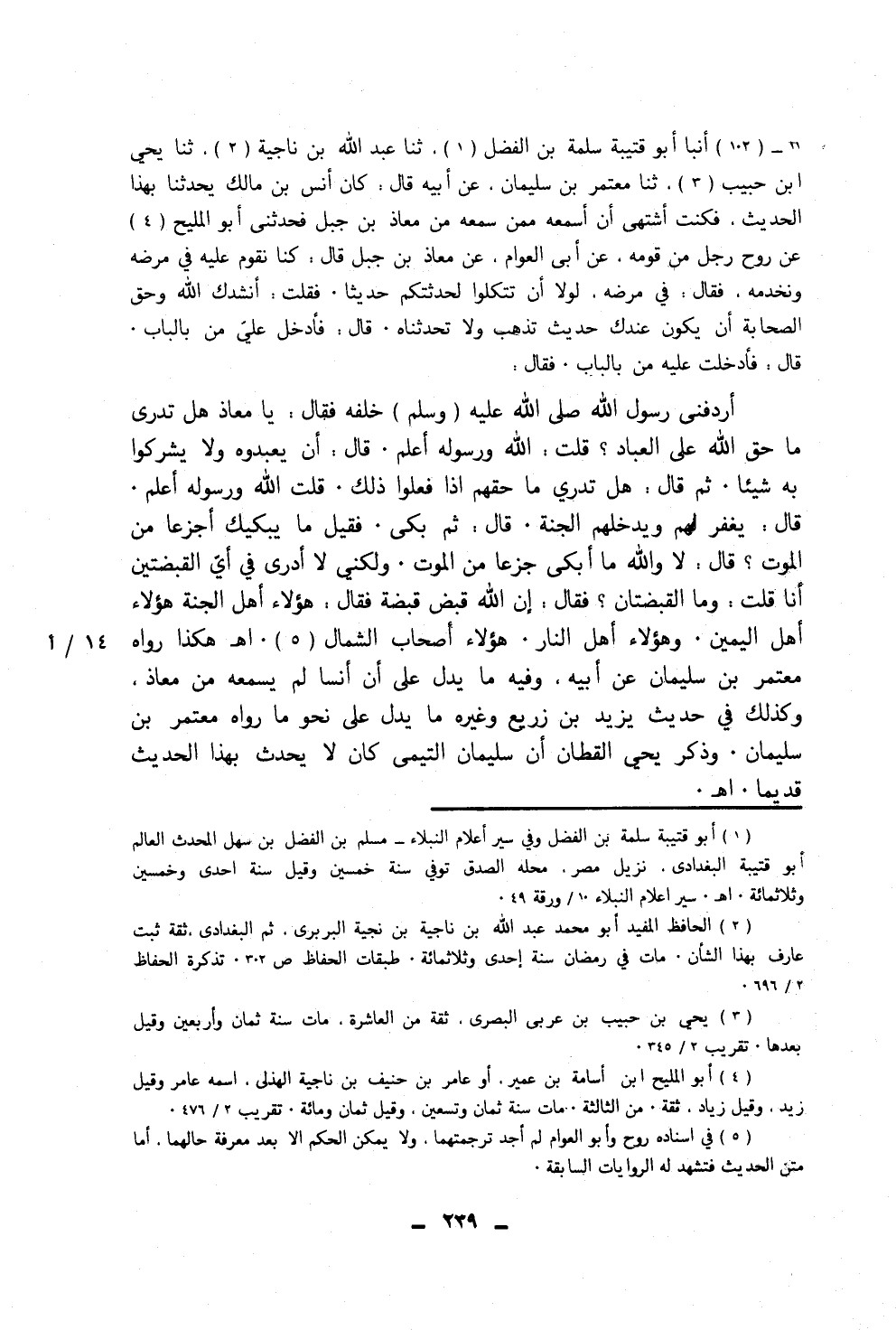 ١٠٢ - أَنْبَأَ أَبُو قُتَيْبَةَ سَلَمَةُ بْنُ الْفَضْلِ، ثَنَا عَبْدُ اللَّهِ بْنُ نَاجِيَةَ، ثَنَا يَحْيَى بْنُ حَبِيبٍ، ثَنَا مُعْتَمِرُ بْنُ سُلَيْمَانَ، عَنْ أَبِيهِ، قَالَ: كَانَ أَنَسُ بْنُ مَالِكٍ يُحَدِّثُنَا بِهَذَا الْحَدِيثِ فَكُنْتُ أَشْتَهِي أَنْ أَسْمَعَهُ مِمَّنْ سَمِعَهُ مِنْ مُعَاذِ بْنِ جَبَلٍ فَحَدَّثَنِي أَبُو الْمَلِيحِ، عَنْ رَوْحٍ رَجُلٍ مِنْ قَوْمِهِ، عَنْ أَبِي الْعَوَّامِ، عَنْ مُعَاذِ بْنِ جَبَلٍ، قَالَ: كُنَّا نَقُومُ عَلَيْهِ فِي مَرَضِهِ وَنَخْدُمُهُ، فَقَالَ فِي مَرَضِهِ: لَوْلَا أَنْ تَتَّكِلُوا لَحَدَّثْتُكُمْ حَدِيثًا، فَقُلْتُ: أَنْشُدُكَ اللَّهَ، وَحَقَّ الصَّحَابَةِ أَنْ يَكُونَ عِنْدَكَ حَدِيثٌ تَذْهَبُ وَلَا تُحَدِّثُنَاهُ، قَالَ: فَأَدْخِلْ عَلَيَّ مَنْ بِالْبَابِ، قَالَ: فَأَدْخَلْتُ عَلَيْهِ مَنْ بِالْبَابِ، فَقَالَ: أَرْدَفَنِي رَسُولُ اللَّهِ صَلَّى اللهُ عَلَيْهِ وَسَلَّمَ خَلْفَهُ، فَقَالَ: «يَا مُعَاذُ هَلْ تَدْرِي مَا حَقُّ اللَّهِ عَلَى الْعِبَادِ؟» ، قُلْتُ: اللَّهُ وَرَسُولُهُ أَعْلَمُ، قَالَ: «أَنْ يَعْبُدُوهُ وَلَا يُشْرِكُوا بِهِ شَيْئًا» ، ثُمَّ قَالَ: «هَلْ تَدْرِي مَا حَقَّهُمْ إِذَا فَعَلُوا ذَلِكَ؟» ، قُلْتُ: اللَّهُ وَرَسُولُهُ أَعْلَمُ، قَالَ: «يَغْفِرُ لَهُمْ وَيُدْخِلُهُمُ الْجَنَّةَ»