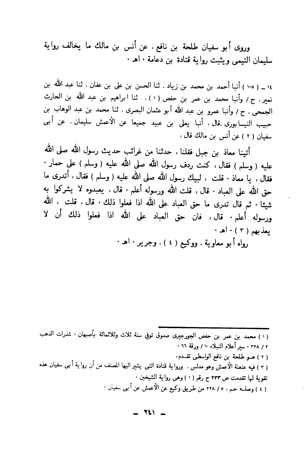 ١٠٥ - أَنْبَأَ أَحْمَدُ بْنُ مُحَمَّدِ بْنِ زِيَادٍ، ثَنَا الْحَسَنُ بْنُ عَلِيِّ بْنِ عَفَّانَ، ثَنَا عَبْدُ اللَّهِ بْنُ نُمَيْرٍ، ح، وَأَنْبَأَ مُحَمَّدُ بْنُ عُمَرَ بْنِ حَفْصٍ، ثَنَا إِبْرَاهِيمُ بْنُ عَبْدِ اللَّهِ بْنِ الْحَارِثِ الْجُمَحِيُّ، ح، وَأَنْبَأَ عَمْرُو بْنُ عَبْدِ اللَّهِ أَبُو عُثْمَانَ الْبَصْرِيُّ، ثَنَا مُحَمَّدُ بْنُ عَبْدِ الْوَهَّابِ بْنِ حَبِيبٍ النَّيْسَابُورِيُّ، قَالَ: أَنْبَأَ يَعْلَى بْنُ عُبَيْدٍ، جَمِيعًا عَنِ الْأَعْمَشِ سُلَيْمَانَ، عَنْ أَبِي سُفْيَانَ، عَنْ أَنَسِ بْنِ مَالِكٍ، قَالَ: أَتَيْنَا مُعَاذَ بْنَ جَبَلٍ، فَقُلْنَا: حَدِّثْنَا مِنْ غَرَائِبِ حَدِيثِ رَسُولِ اللَّهِ صَلَّى اللهُ عَلَيْهِ وَسَلَّمَ، فَقَالَ: كُنْتُ رِدْفَ رَسُولِ اللَّهِ صَلَّى اللهُ عَلَيْهِ وَسَلَّمَ عَلَى حِمَارٍ، فَقَالَ: «يَا مُعَاذُ» ، قُلْتُ: لَبَّيْكَ رَسُولَ اللَّهِ صَلَّى اللهُ عَلَيْهِ وَسَلَّمَ، فَقَالَ: «أَتَدْرِي مَا حَقُّ اللَّهِ عَلَى الْعِبَادِ؟» ، قَالَ: قُلْتُ: اللَّهُ وَرَسُولُهُ أَعْلَمُ، قَالَ: «يَعْبُدُوهُ لَا يُشْرِكُوا بِهِ شَيْئًا» ، ثُمَّ قَالَ: «تَدْرِي مَا حَقُّ الْعِبَادِ عَلَى اللَّهِ إِذَا فَعَلُوا ذَلِكَ؟» ، قَالَ: قُلْتُ: اللَّهُ وَرَسُولُهُ أَعْلَمُ، قَالَ: «فَإِنَّ حَقَّ الْعِبَادِ عَلَى اللَّهِ إِذَا فَعَلُوا ذَلِكَ أَنْ لَا يُعَذِّبَهُمْ» . رَوَاهُ أَبُو مُعَاوِيَةَ، وَوَكِيعٌ، وَجَرِيرٌ