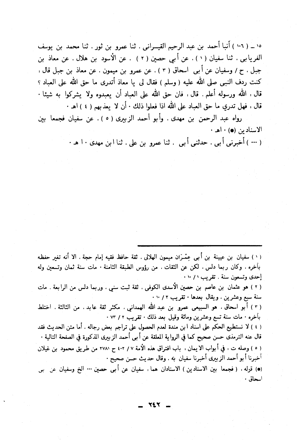١٠٦ - أَنْبَأَ أَحْمَدُ بْنُ عَبْدِ الرَّحِيمِ الْقَيْسَرَانِيُّ، ثَنَا عَمْرُو بْنُ ثَوْرٍ، ثَنَا مُحَمَّدُ بْنُ يُوسُفَ الْفِرْيَابِيُّ، ثَنَا سُفْيَانُ، عَنْ أَبِي حَصِينٍ، عَنِ الْأَسْوَدِ بْنِ هِلَالٍ، عَنْ مُعَاذِ بْنِ جَبَلٍ، ح، وَسُفْيَانُ، عَنْ أَبِي إِسْحَاقَ، عَنْ عَمْرِو بْنِ مَيْمُونٍ، عَنْ مُعَاذِ بْنِ جَبَلٍ، قَالَ: كُنْتُ رِدْفَ النَّبِيِّ صَلَّى اللهُ عَلَيْهِ وَسَلَّمَ، فَقَالَ لِي: «يَا مُعَاذُ أَتَدْرِي مَا حَقُّ اللَّهِ عَلَى الْعِبَادِ؟» ، قَالَ: اللَّهُ وَرَسُولُهُ أَعْلَمُ، قَالَ: «فَإِنَّ حَقَّ اللَّهِ عَلَى الْعِبَادِ أَنْ يَعْبُدُوهُ وَلَا يُشْرِكُوا بِهِ شَيْئًا» ، قَالَ: «فَهَلْ تَدْرِي مَا حَقُّ الْعِبَادِ عَلَى اللَّهِ إِذَا فَعَلُوا ذَلِكَ؟ أَنْ لَا يُعَذِّبَهُمْ» . رَوَاهُ عَبْدُ الرَّحْمَنِ بْنُ مَهْدِيِّ، وَأَبُو أَحْمَدَ الزُّبَيْرِيُّ، عَنْ سُفْيَانَ فَجَمَعَا بَيْنَ الْإِسْنَادَيْنِ. أَخْبَرَنِي أَبِي، حَدَّثَنِي أَبِي، ثَنَا عَمْرُو بْنُ عَلِيٍّ، ثَنَا ابْنُ مَهْدِيٍّ ⦗٢٤٣⦘. وَرَوَاهُ شُعْبَةُ، وَإِسْرَائِيلُ، وَمَعْمَرٌ، وَفُضَيْلُ بْنُ مَرْزُوقٍ، وَأَبُو الْأَحْوَصِ، عَنْ أَبِي إِسْحَاقَ، عَنْ عَمْرِو بْنِ مَيْمُونٍ