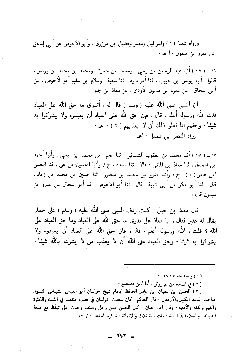 ١٠٨ - أَنْبَأَ مُحَمَّدُ بْنُ يَعْقُوبَ الشَّيْبَانِيُّ، ثَنَا يَحْيَى بْنُ مُحَمَّدِ بْنِ يَحْيَى، وَأَنْبَأَ أَحْمَدُ بْنُ إِسْحَاقَ، ثَنَا مُعَاذُ بْنُ الْمُثَنَّى، قَالَا: ثَنَا مُسَدَّدٌ، ح وَأَنْبَأَ الْحُسَيْنُ بْنُ عَلِيٍّ، ثَنَا الْحَسَنُ بْنُ عَامِرٍ، ح وَأَنْبَأَ عَمْرُو بْنُ مُحَمَّدِ بْنِ مَنْصُورٍ، ثَنَا حُسَيْنُ بْنُ مُحَمَّدِ بْنِ زِيَادٍ، قَالَ: ثَنَا أَبُو بَكْرِ بْنُ أَبِي شَيْبَةَ، قَالَ: ثَنَا أَبُو الْأَحْوَصِ، ثَنَا أَبُو إِسْحَاقَ، عَنْ عَمْرِو بْنِ مَيْمُونٍ، قَالَ: قَالَ مُعَاذُ بْنُ جَبَلٍ: كُنْتُ رِدْفَ النَّبِيِّ صَلَّى اللهُ عَلَيْهِ وَسَلَّمَ عَلَى حِمَارٍ يُقَالُ لَهُ عُفَيْرٌ، فَقَالَ: «يَا مُعَاذُ هَلْ تَدْرِي مَا حَقُّ اللَّهِ عَلَى الْعِبَادِ وَمَا حَقُّ الْعِبَادِ عَلَى اللَّهِ؟» ، قُلْتُ: اللَّهُ وَرَسُولُهُ أَعْلَمُ، قَالَ: «فَإِنَّ حَقَّ اللَّهِ عَلَى الْعِبَادِ أَنْ يَعْبُدُوهُ، وَلَا يُشْرِكُوا بِهِ شَيْئًا، وَحَقَّ الْعِبَادِ عَلَى اللَّهِ أَنْ لَا يُعَذَّبَ مَنْ لَا يُشْرِكُ بِاللَّهِ شَيْئًا» ⦗٢٤٤⦘، قُلْتُ: يَا رَسُولَ اللَّهِ أَفَلَا أُبَشِّرُ النَّاسَ؟، قَالَ: «لَا تُبَشِّرْهُمْ فَيَتَّكِلُوا» . رَوَاهُ جَمَاعَةٌ، عَنْ أَبِي الْأَحْوَصِ، «وَفِيهِ زِيَادَةٌ أَنَّ الْحِمَارَ يُقَالُ لَهُ عُفَيْرٌ» . وَرَوَاهُ أَبُو مَسْعُودٍ، عَنْ أَبِي دَاوُدَ، عَنْ شُعْبَةَ. «وَفِيهِ هَذِهِ الزِّيَادَةُ وَهُوَ وَهْمٌ» . وَرَوَاهُ إِسْرَائِيلُ، عَنْ أَبِي إِسْحَاقَ