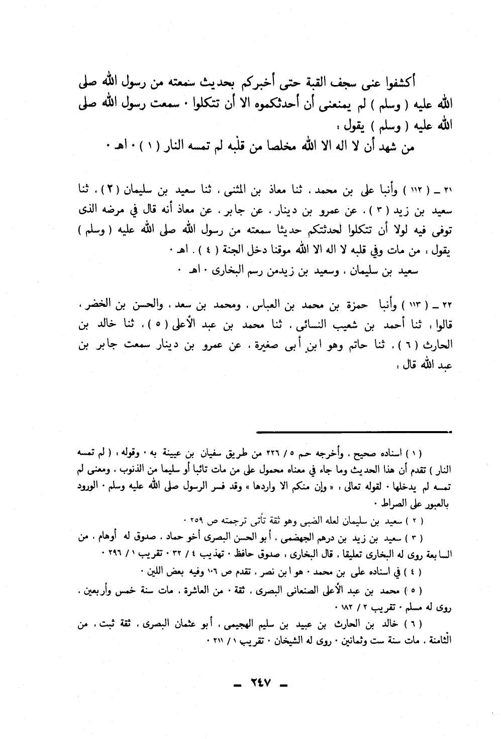١١٢ - وَأَنْبَأَ عَلِيُّ بْنُ مُحَمَّدٍ، ثَنَا مُعَاذُ بْنُ الْمُثَنَّى، ثَنَا سَعِيدُ بْنُ سُلَيْمَانَ، ثَنَا سَعِيدُ بْنُ زَيْدٍ، عَنْ عَمْرِو بْنِ دِينَارٍ، عَنْ جَابِرٍ، عَنْ مُعَاذٍ، أَنَّهُ قَالَ فِي مَرَضِهِ الَّذِي تُوُفِّيَ فِيهِ: لَوْلَا أَنْ تَتَّكِلُوا لَحَدَّثْتُكُمْ حَدِيثًا سَمِعْتُهُ مِنْ رَسُولِ اللَّهِ صَلَّى اللهُ عَلَيْهِ وَسَلَّمَ، يَقُولُ: «مَنْ مَاتَ وَفِي قَلْبِهِ لَا إِلَهَ إِلَّا اللَّهُ مُوقِنًا دَخَلَ الْجَنَّةَ» . «سَعِيدُ بْنُ سُلَيْمَانَ وَسَعِيدُ بْنُ زَيْدٍ مِنْ رَسْمِ الْبُخَارِيِّ»
