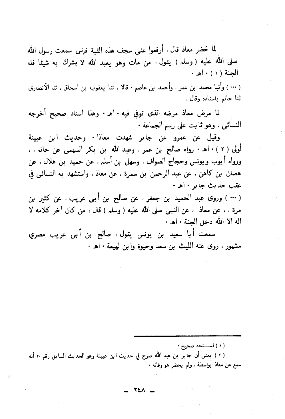 وَرَوَى عَبْدُ الْحَمِيدِ بْنُ جَعْفَرٍ، عَنْ صَالِحِ بْنِ أَبِي عَرِيبٍ، عَنْ كَثِيرِ بْنِ مُرَّةَ، عَنْ مُعَاذٍ، عَنِ النَّبِيِّ صَلَّى اللهُ عَلَيْهِ وَسَلَّمَ، قَالَ: «مَنْ كَانَ آخِرُ كَلَامِهِ لَا إِلَهَ إِلَّا اللَّهُ دَخَلَ الْجَنَّةَ» . سَمِعْتُ أَبَا سَعِيدِ بْنَ يُونُسَ يَقُولُ: صَالِحُ بْنُ أَبِي عَرِيبٍ مِصْرِيُّ مَشْهُورٌ، رَوَى عَنْهُ اللَّيْثُ بْنُ سَعْدٍ، وَحَيْوَةُ، وَابْنُ لَهِيعَةَ