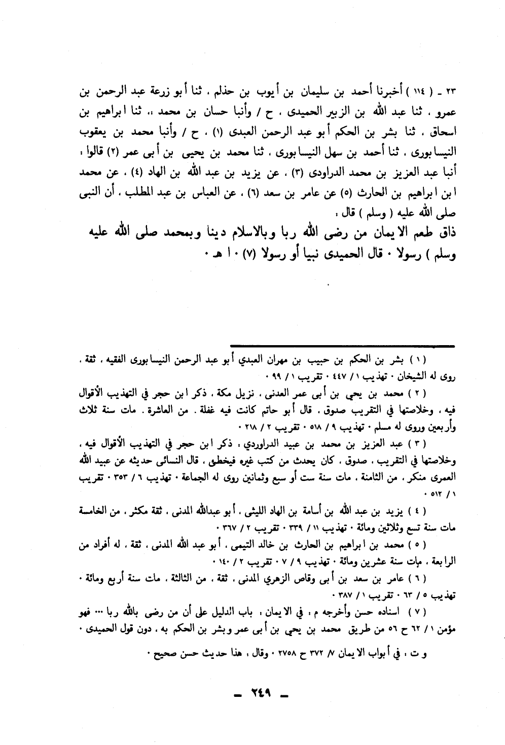 ١١٤ - أَخْبَرَنَا أَحْمَدُ بْنُ سُلَيْمَانَ بْنِ أَيُّوبَ بْنِ حَذْلَمٍ، ثَنَا أَبُو زُرْعَةَ عَبْدُ الرَّحْمَنِ بْنُ عَمْرٍو، ثَنَا عَبْدُ اللَّهِ بْنُ الزُّبَيْرِ الْحُمَيْدِيُّ، ح، وَأَنْبَأَ حَسَّانُ بْنُ مُحَمَّدٍ، ثَنَا إِبْرَاهِيمُ بْنُ إِسْحَاقَ، ثَنَا بِشْرُ بْنُ الْحَكَمِ أَبُو عَبْدِ الرَّحْمَنِ الْعَبْدِيُّ، ح، وَأَنْبَأَ مُحَمَّدُ بْنُ يَعْقُوبَ النَّيْسَابُورِيُّ، ثَنَا أَحْمَدُ بْنُ سَهْلٍ النَّيْسَابُورِيُّ، ثَنَا مُحَمَّدُ بْنُ يَحْيَى بْنِ أَبِي عُمَرَ، قَالُوا: أَنْبَأَ عَبْدُ الْعَزِيزِ بْنُ مُحَمَّدٍ الدَّرَاوَرْدِيُّ، عَنْ يَزِيدَ بْنِ عَبْدِ اللَّهِ بْنِ الْهَادِ، عَنْ مُحَمَّدِ بْنِ إِبْرَاهِيمَ بْنِ الْحَارِثِ، عَنْ عَامِرِ بْنِ سَعْدٍ، عَنِ الْعَبَّاسِ بْنِ عَبْدِ الْمُطَّلِبِ، أَنَّ النَّبِيَّ صَلَّى اللهُ عَلَيْهِ وَسَلَّمَ، قَالَ: «ذَاقَ طَعْمَ الْإِيمَانِ مَنْ رَضِيَ اللَّهَ رَبًّا، وَبِالْإِسْلَامِ دِينًا وَبِمُحَمَّدٍ صَلَّى اللهُ عَلَيْهِ وَسَلَّمَ رَسُولًا» ،. قَالَ الْحُمَيْدِيُّ: «نَبِيًّا أَوْ رَسُولًا»