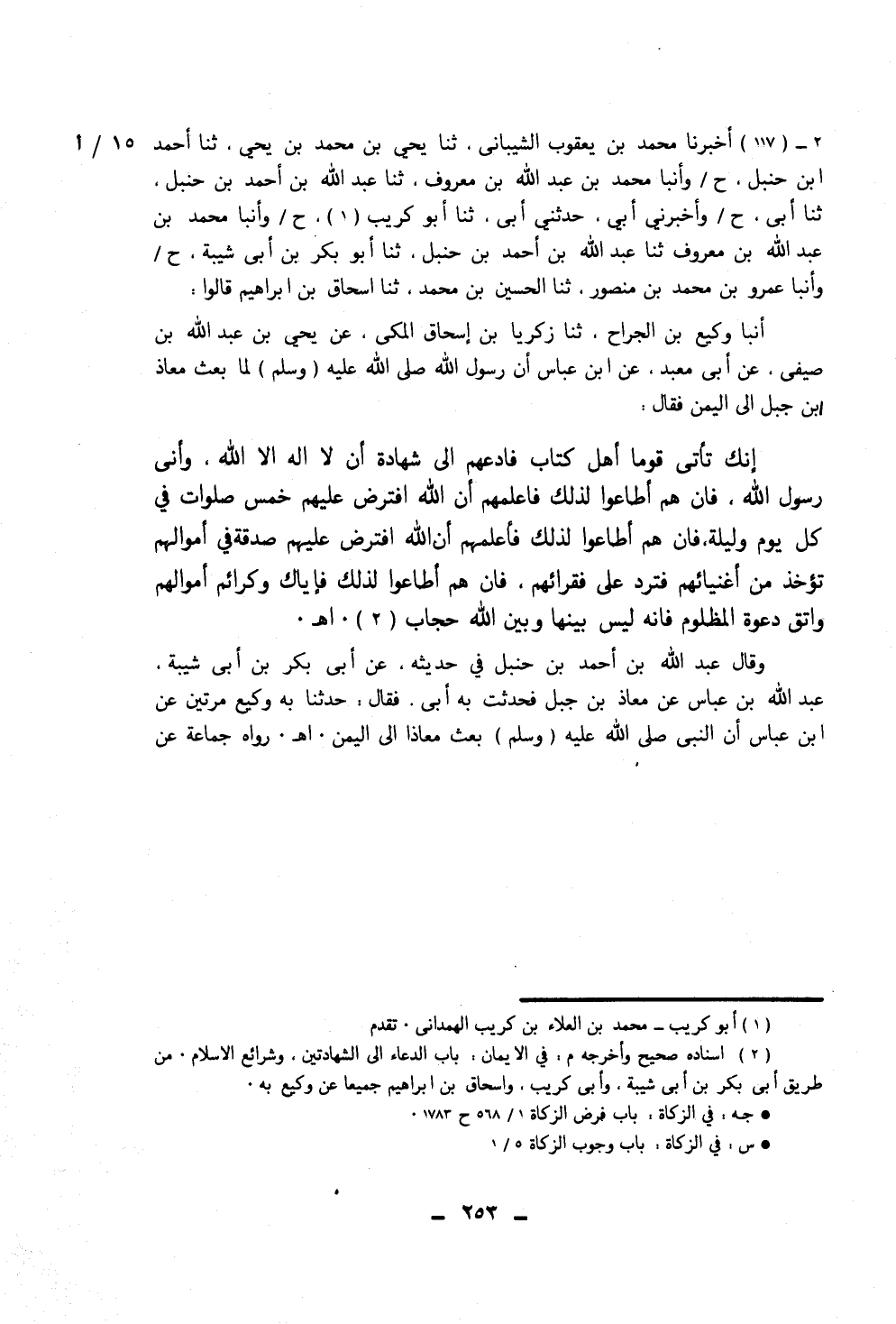 ١١٧ - أَخْبَرَنَا مُحَمَّدُ بْنُ يَعْقُوبَ الشَّيْبَانِيُّ، ثَنَا يَحْيَى بْنُ مُحَمَّدِ بْنِ يَحْيَى، ثَنَا أَحْمَدُ بْنُ حَنْبَلٍ، ح، وَأَنْبَأَ مُحَمَّدُ بْنُ عَبْدِ اللَّهِ بْنِ مَعْرُوفٍ، ثَنَا عَبْدُ اللَّهِ بْنُ أَحْمَدَ بْنِ حَنْبَلٍ، ثَنَا أَبِي، ح، وَأَخْبَرَنِي أَبِي، حَدَّثَنِي أَبِي، ثَنَا أَبُو كُرَيْبٍ، ح، وَأَنْبَأَ مُحَمَّدُ بْنُ عَبْدِ اللَّهِ بْنِ مَعْرُوفٍ، ثَنَا عَبْدُ اللَّهِ بْنُ أَحْمَدَ بْنِ حَنْبَلٍ، ثَنَا أَبُو بَكْرِ بْنُ أَبِي شَيْبَةَ، ح، وَأَنْبَأَ عَمْرُو بْنُ مُحَمَّدِ بْنِ مَنْصُورٍ، ثَنَا الْحُسَيْنُ بْنُ مُحَمَّدٍ، ثَنَا إِسْحَاقُ بْنُ إِبْرَاهِيمَ، قَالُوا: أَنْبَأَ وَكِيعُ بْنُ الْجَرَّاحِ، ثَنَا زَكَرِيَّا بْنُ إِسْحَاقَ الْمَكِّيُّ، عَنْ يَحْيَى بْنِ عَبْدِ اللَّهِ بْنِ صَيْفِيٍّ، عَنْ أَبِي مَعْبَدٍ، عَنِ ابْنِ عَبَّاسٍ، أَنَّ رَسُولَ اللَّهِ صَلَّى اللهُ عَلَيْهِ وَسَلَّمَ لَمَّا بَعَثَ مُعَاذَ بْنَ جَبَلٍ إِلَى الْيَمَنِ فَقَالَ: «إِنَّكَ تَأْتِي قَوْمًا أَهْلَ كِتَابٍ، فَادْعُهُمْ إِلَى شَهَادَةِ أَنْ لَا إِلَهَ إِلَّا اللَّهُ، وَأَنِّي رَسُولُ اللَّهِ، فَإِنْ هُمْ أَطَاعُوا لِذَلِكَ فَأَعْلِمْهُمْ أَنَّ اللَّهَ افْتَرَضَ عَلَيْهِمْ خَمْسَ صَلَوَاتٍ فِي كُلِّ يَوْمٍ وَلَيْلَةٍ، فَإِنْ هُمْ أَطَاعُوا لِذَلِكَ فَأَعْلِمْهُمْ أَنَّ اللَّهَ افْتَرَضَ عَلَيْهِمْ صَدَقَةً فِي أَمْوَالِهِمْ تُؤْخَذُ مِنْ أَغْنِيَائِهِمْ فَتُرَدُّ عَلَى فُقَرَائِهِمْ، فَإِنْ هُمْ أَطَاعُوا لِذَلِكَ فَإِيَّاكَ وَكَرَائِمَ أَمْوَالِهِمْ، وَاتَّقِ دَعْوَةَ الْمَظْلُومِ فَإِنَّهُ لَيْسَ بَيْنَهَا وَبَيْنَ اللَّهِ حِجَابٌ» . وَقَالَ عَبْدُ اللَّهِ بْنُ أَحْمَدَ بْنِ حَنْبَلٍ فِي حَدِيثِهِ، عَنْ أَبِي بَكْرِ بْنِ أَبِي شَيْبَةَ: عَبْدِ اللَّهِ بْنِ عَبَّاسٍ، عَنْ مُعَاذِ بْنِ جَبَلٍ، فَحَدَّثْتُ بِهِ أَبِي، فَقَالَ: حَدَّثَنَا بِهِ وَكِيعٌ مَرَّتَيْنِ عَنِ ابْنِ عَبَّاسٍ أَنَّ النَّبِيَّ صَلَّى اللهُ عَلَيْهِ وَسَلَّمَ بَعَثَ مُعَاذًا إِلَى الْيَمَنِ رَوَاهُ جَمَاعَةٌ، عَنْ ⦗٢٥٤⦘ زَكَرِيَّاءَ بْنِ إِسْحَاقَ مِنْهُمْ سُفْيَانُ الثَّوْرِيُّ، وَعَبْدُ اللَّهِ بْنُ الْمُبَارَكِ، وَبِشْرُ بْنُ السَّرِيِّ، وَعَبْدُ الْأَعْلَى بْنُ عَبْدِ الْأَعْلَى. وَرَوَاهُ إِسْمَاعِيلُ بْنُ أُمَيَّةَ، عَنْ يَحْيَى بْنِ عَبْدِ اللَّهِ بْنِ صَيْفِيٍّ، عَنْ أَبِي مَعْبَدٍ، عَنِ ابْنِ عَبَّاسٍ: أَنَّ النَّبِيَّ صَلَّى اللهُ عَلَيْهِ وَسَلَّمَ بَعَثَ مُعَاذًا. وَرَوَاهُ عَنْ إِسْمَاعِيلَ رَوْحُ بْنُ الْقَاسِمِ، وَالْفَضْلُ بْنُ عَلَاءٍ وَغَيْرُهُمَا، " وَلَمْ يَذْكُرْ وَاحِدٌ مِنْهُمْ عَنِ ابْنِ عَبَّاسٍ، عَنْ مُعَاذٍ إِلَّا فِي رِوَايَةِ ابْنِ أَبِي شَيْبَةَ، عَنْ وَكِيعٍ. وَرُبَّمَا قَالَ فِي حَدِيثِهِ: عَنِ ابْنِ عَبَّاسٍ، عَنْ مُعَاذٍ، وَرُبَّمَا قَالَ: عَنِ ابْنِ عَبَّاسٍ أَنَّ النَّبِيَّ صَلَّى اللهُ عَلَيْهِ وَسَلَّمَ بَعَثَ مُعَاذًا «. وَكَذَلِكَ رِوَايَةُ إِسْحَاقَ بْنِ رَاهَوَيْهِ، وَأَبِي كُرَيْبٍ وَجَمَاعَةٍ نَحْوَ رِوَايَةِ أَحْمَدَ بْنِ حَنْبَلٍ عَنْ وَكِيعٍ.» وَهَذَا حَدِيثٌ مُجْمَعٌ عَلَى صِحَّتِهِ مِنْ هَذِهِ الطُّرُقِ كُلِّهَا، وَاخْتَلَفُوا فِي أَلْفَاظِهَا عَنِ ابْنِ عَبَّاسٍ فَقِيلَ عَنْهُ: فَإِذَا عَلِمُوا أَوْ عَرَفُوا وَقِيلَ: «فَإِنْ هُمْ أَطَاعُوكَ» . ". وَرَوَى ابْنُ عُمَرَ، وَأَبُو هُرَيْرَةَ: «فَإِذَا شَهِدُوا أَنْ لَا إِلَهَ إِلَّا اللَّهُ» ، وَفِي حَدِيثِ أَبِي بَكْرٍ، وَعُمَرَ رَضِيَ اللَّهُ عَنْهُما: «فَإِذَا قَالُوهَا»
