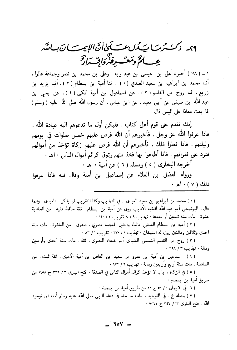 ١١٨ - أَخْبَرَنَا عَلِيُّ بْنُ عِيسَى بْنِ عَبْدُوَيْهِ، وَعَلِيُّ بْنُ مُحَمَّدِ بْنِ نَصْرٍ، وَجَمَاعَةٌ، قَالُوا: أَنْبَأَ مُحَمَّدُ بْنُ إِبْرَاهِيمَ بْنِ سَعِيدٍ الْعَبْدِيُّ، ثَنَا أُمَيَّةُ بْنُ بِسْطَامٍ، أَنْبَأَ يَزِيدُ بْنُ زُرَيْعٍ، ثَنَا رَوْحُ بْنُ الْقَاسِمِ، عَنْ إِسْمَاعِيلَ بْنِ أُمَيَّةَ الْمَكِّيِّ، عَنْ يَحْيَى بْنِ عَبْدِ اللَّهِ بْنِ صَيْفِيٍّ، عَنْ أَبِي مَعْبَدٍ، عَنِ ابْنِ عَبَّاسٍ، أَنَّ رَسُولَ اللَّهِ صَلَّى اللهُ عَلَيْهِ وَسَلَّمَ لَمَّا بَعَثَ مُعَاذًا عَلَى الْيَمَنِ قَالَ: «إِنَّكَ تَقْدُمُ عَلَى قَوْمٍ أَهْلِ كِتَابٍ فَلْيَكُنْ أَوَّلُ مَا تَدْعُوهُمْ إِلَيْهِ عُبَادَةَ اللَّهِ، فَإِذَا عَرَفُوا اللَّهَ عَزَّ وَجَلَّ فَأَخْبِرْهُمْ أَنَّ اللَّهَ فَرَضَ عَلَيْهِمْ خَمْسَ صَلَوَاتٍ فِي يَوْمِهِمْ، وَلَيْلَتِهِمْ فَإِذَا فَعَلُوا ذَلِكَ، فَأَخْبِرْهُمْ أَنَّ اللَّهَ فَرَضَ عَلَيْهِمْ زَكَاةً تُؤْخَذُ مِنْ أَمْوَالِهِمْ، فَتُرَدُّ عَلَى فُقَرَائِهِمْ فَإِذَا أَطَاعُوا بِهَا فَخُذْ مِنْهُمْ، وَتَوَقِّ كَرَائِمَ أَمْوَالِ النَّاسِ» أَخْرَجَهُ الْبُخَارِيُّ، وَمُسْلِمٌ عَنْ أُمَيَّةَ وَرَوَاهُ الْفَضْلُ بْنُ الْعَلَاءِ، عَنْ إِسْمَاعِيلَ بْنِ أُمَيَّةَ وَقَالَ فِيهِ: فَإِذَا عَرَفُوا ذَلِكَ