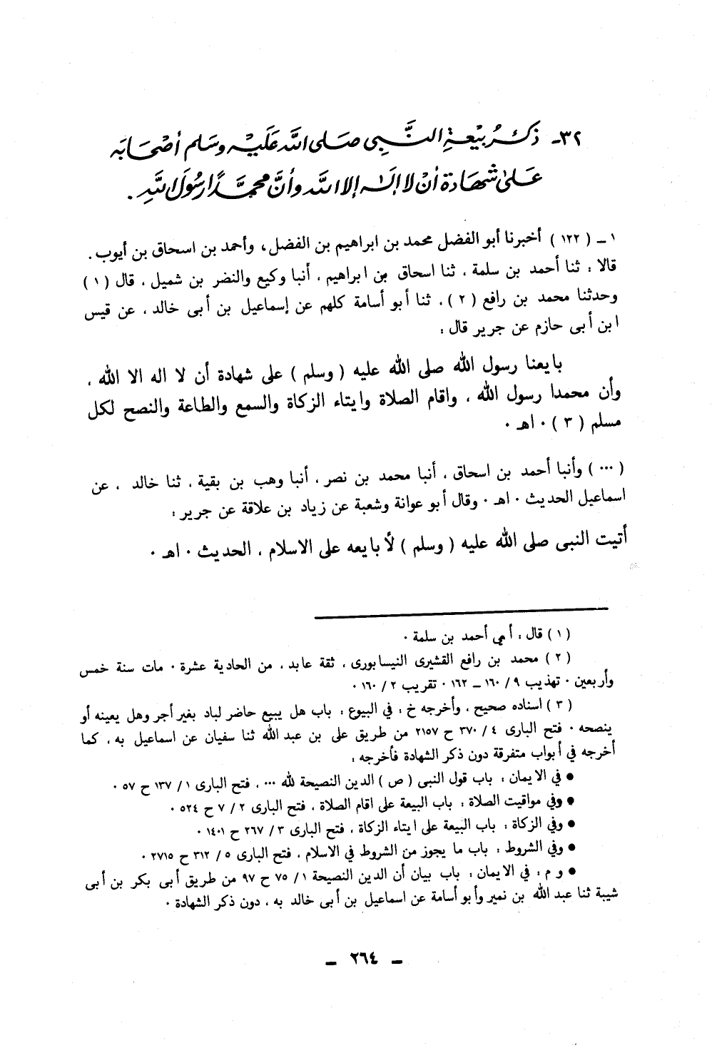 ١٢٢ - أَخْبَرَنَا أَبُو الْفَضْلِ مُحَمَّدُ بْنُ إِبْرَاهِيمَ بْنِ الْفَضْلِ، وَأَحْمَدُ بْنُ إِسْحَاقَ بْنِ أَيُّوبَ، قَالَا: ثَنَا أَحْمَدُ بْنُ سَلَمَةَ، ثَنَا إِسْحَاقُ بْنُ إِبْرَاهِيمَ، أَنْبَأَ وَكِيعٌ، وَالنَّضْرُ بْنُ شُمَيْلٍ، قَالَ: وَحَدَّثَنَا مُحَمَّدُ بْنُ رَافِعٍ، ثَنَا أَبُو أُسَامَةَ، كُلُّهُمْ عَنْ إِسْمَاعِيلَ بْنِ أَبِي خَالِدٍ، عَنْ قَيْسِ بْنِ أَبِي حَازِمٍ، عَنْ جَرِيرٍ، قَالَ: «بَايَعْنَا رَسُولَ اللَّهِ صَلَّى اللهُ عَلَيْهِ وَسَلَّمَ عَلَى شَهَادَةِ أَنْ لَا إِلَهَ إِلَّا اللَّهُ، وَأَنَّ مُحَمَّدًا رَسُولُ اللَّهِ، وَإِقَامِ الصَّلَاةِ، وَإِيتَاءِ الزَّكَاةِ، وَالسَّمْعِ، وَالطَّاعَةِ، وَالنُّصْحِ لِكُلِّ مُسْلِمٍ» . وَأَنْبَأَ أَحْمَدُ بْنُ إِسْحَاقَ، أَنْبَأَ مُحَمَّدُ بْنُ نَصْرٍ، أَنْبَأَ وَهْبُ بْنُ بَقِيَّةَ، ثَنَا خَالِدٌ، عَنْ إِسْمَاعِيلَ الْحَدِيثَ. وَقَالَ أَبُو عَوَانَةَ، وَشُعْبَةُ، عَنْ زِيَادِ بْنِ عِلَاقَةَ، عَنْ جَرِيرٍ: أَتَيْتُ النَّبِيَّ صَلَّى اللهُ عَلَيْهِ وَسَلَّمَ لِأُبَايعَهُ عَلَى الْإِسْلَامِ. الْحَدِيثَ