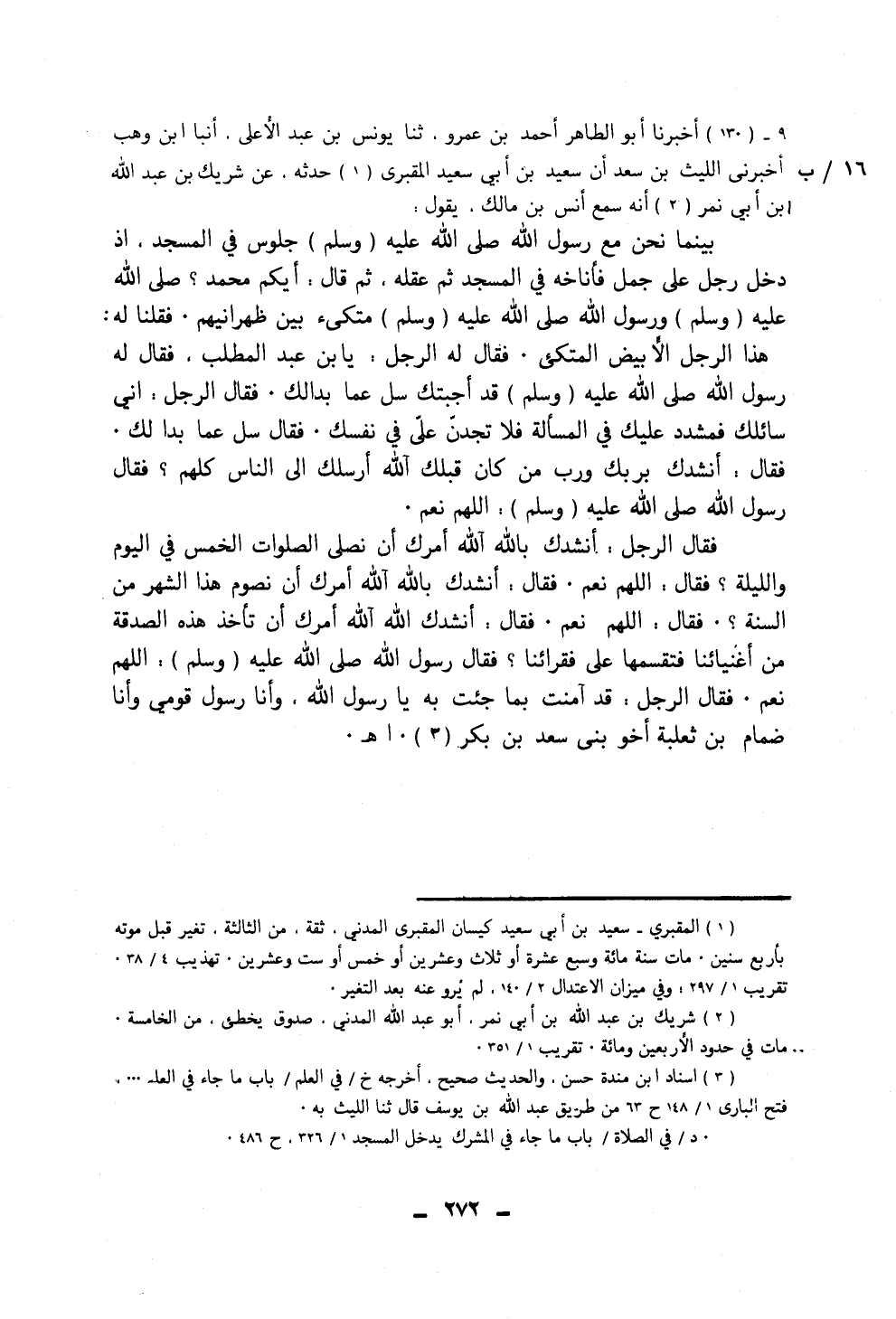١٣٠ - أَخْبَرَنَا أَبُو الطَّاهِرِ أَحْمَدُ بْنُ عَمْرٍو، ثَنَا يُونُسُ بْنُ عَبْدِ الْأَعْلَى، أَنْبَأَ ابْنُ وَهْبٍ، أَخْبَرَنِي اللَّيْثُ بْنُ سَعْدٍ، أَنَّ سَعِيدَ بْنَ أَبِي سَعِيدٍ الْمَقْبُرِيَّ، حَدَّثَهُ عَنْ شَرِيكِ بْنِ عَبْدِ اللَّهِ بْنِ أَبِي نَمِرٍ، أَنَّهُ سَمِعَ أَنَسَ بْنَ مَالِكٍ، يَقُولُ: بَيْنَمَا نَحْنُ مَعَ رَسُولِ اللَّهِ صَلَّى اللهُ عَلَيْهِ وَسَلَّمَ جُلُوسٌ فِي الْمَسْجِدِ إِذْ دَخَلَ رَجُلٌ عَلَى جَمَلٍ فَأَنَاخَهُ فِي الْمَسْجِدِ، ثُمَّ عَقَلَهُ، ثُمَّ قَالَ: أَيُّكُمْ مُحَمَّدٌ صَلَّى اللهُ عَلَيْهِ وَسَلَّمَ؟، وَرَسُولُ اللَّهِ صَلَّى اللهُ عَلَيْهِ وَسَلَّمَ مُتَّكِئٌ بَيْنَ ظَهْرَانَيْهِمْ، فَقُلْنَا لَهُ: هَذَا الرَّجُلُ الْأَبْيَضُ الْمُتَّكِئُ، فَقَالَ لَهُ الرَّجُلُ: يَا ابْنَ عَبْدِ الْمُطَّلِبِ، فَقَالَ لَهُ رَسُولُ اللَّهِ صَلَّى اللهُ عَلَيْهِ وَسَلَّمَ: «قَدْ أَجَبْتُكَ سَلْ عَمَّا بَدَا لَكَ» ، فَقَالَ الرَّجُلُ: إِنِّي سَائِلُكَ فَمُشَدِّدٌ عَلَيْكَ فِي الْمَسْأَلَةِ فَلَا تَجِدَنَّ عَلَيَّ فِي نَفْسِكَ، فَقَالَ: «سَلْ عَمَّا بَدَا لَكَ» ، فَقَالَ: أَنْشُدُكَ بِرَبِّكِ وَرَبِّ مَنْ كَانَ قَبْلَكَ، آللَّهُ أَرْسَلَكَ إِلَى النَّاسِ كُلِّهِمْ؟، فَقَالَ رَسُولُ اللَّهِ صَلَّى اللهُ عَلَيْهِ وَسَلَّمَ: «اللَّهُمَّ نَعَمْ» ، فَقَالَ الرَّجُلُ: أَنْشُدُكَ بِاللَّهِ آللَّهُ أَمَرَكَ أَنْ نُصَلِّيَ الصَّلَوَاتِ الْخَمْسَ فِي الْيَوْمِ وَاللَّيْلَةِ؟، فَقَالَ: «اللَّهُمَّ نَعَمْ» ، فَقَالَ: أَنْشُدُكَ بِاللَّهِ آللَّهُ أَمَرَكَ أَنْ نَصُومَ هَذَا الشَّهْرَ مِنَ السَّنَةِ؟، فَقَالَ: «اللَّهُمَّ نَعَمْ» ، فَقَالَ: أَنْشُدُكَ اللَّهَ آللَّهُ أَمَرَكَ أَنْ تَأْخُذَ هَذِهِ الصَّدَقَةَ مِنْ أَغْنِيَائِنَا فَتَقْسِمَهَا عَلَى فُقَرَائِنَا؟، فَقَالَ رَسُولُ اللَّهِ صَلَّى اللهُ عَلَيْهِ وَسَلَّمَ: «اللَّهُمَّ نَعَمْ» ، فَقَالَ الرَّجُلُ: قَدْ آمَنْتُ بِمَا جِئْتَ بِهِ يَا رَسُولَ اللَّهِ وَأَنَا رَسُولُ قَوْمِي، وَأَنَا ضِمَامُ بْنُ ثَعْلَبَةَ أَخُو بَنِي سَعْدِ بْنِ بَكْرٍ ⦗٢٧٣⦘. رَوَاهُ مُحَمَّدُ بْنُ رُمْحٍ، وَزُغْبَةُ، وَغَيْرُ وَاحِدٍ، عَنِ اللَّيْثِ بْنِ سَعْدٍ. وَرَوَاهُ ابْنُ أَبِي فُدَيْكٍ، عَنِ الضَّحَّاكِ بْنِ عُثْمَانَ، عَنْ سَعِيدٍ الْمَقْبُرِيِّ، عَنْ أَبِي هُرَيْرَةَ. وَرَوَاهُ يَزِيدُ بْنُ هَارُونَ، وَغَيْرُهُ، عَنْ مُحَمَّدِ بْنِ عَمْرٍو، عَنْ شَرِيكِ بْنِ أَبِي نَمِرٍ أَنَّ ضِمَامَ بْنَ ثَعْلَبَةَ. «قَدِمَ لَمْ يَذْكُرْ أَنَسًا» . وَرَوَاهُ إِبْرَاهِيمُ بْنُ سَعْدٍ، عَنْ مُحَمَّدِ بْنِ إِسْحَاقَ، عَنْ سَلَمَةَ بْنِ كُهَيْلٍ، وَمُحَمَّدُ بْنُ الْوَلِيدِ بْنِ نُوَيْفِعٍ الْمَدِينِيُّ، عَنْ كُرَيْبٍ، عَنِ ابْنِ عَبَّاسٍ وَزَادَ فِيهِ: أَنْشُدُكَ اللَّهَ إِلَهَكَ وَإِلَهَ مَنْ قَبْلَكَ وَإِلَهَ مَنْ هُوَ كَائِنٌ بَعْدَكَ آللَّهُ بَعَثَكَ إِلَيْنَا رَسُولًا؟، قَالَ: «اللَّهُمَّ نَعَمْ» ، وَأَمَرَكَ أَنْ نَعْبُدَهُ لَا نُشْرِكُ بِهِ شَيْئًا وَأَنْ نَخْلَعَ هَذِهِ الْأَنْدَادَ الَّتِي كَانَ آبَاؤُنَا يَعْبُدُونَ، قَالَ: «اللَّهُمَّ نَعَمْ» وَبَاقِي الْحَدِيثِ نَحْوَهُ. وَرَوَاهُ الْفَرْوِيُّ، عَنْ عَبْدِ الْمَلِكِ بْنِ قُدَامَةَ، عَنْ عَبْدِ الرَّحْمَنِ بْنِ عَبْدِ اللَّهِ بْنِ دِينَارٍ، عَنْ أَبِيهِ، عَنِ ابْنِ عُمَرَ، عَنْ ضِمَامٍ. «وَرَوَاهُ دَاوُدُ بْنُ أَبِي هِنْدٍ، عَنْ عَمْرِو بْنِ سَعِيدٍ، عَنْ سَعِيدِ بْنِ جُبَيْرٍ، عَنِ ابْنِ عَبَّاسٍ فَخَالَفَ لَفْظَ مَا تَقَدَّمَ» . وَأَخْرَجَهُ مُسْلِمٌ
