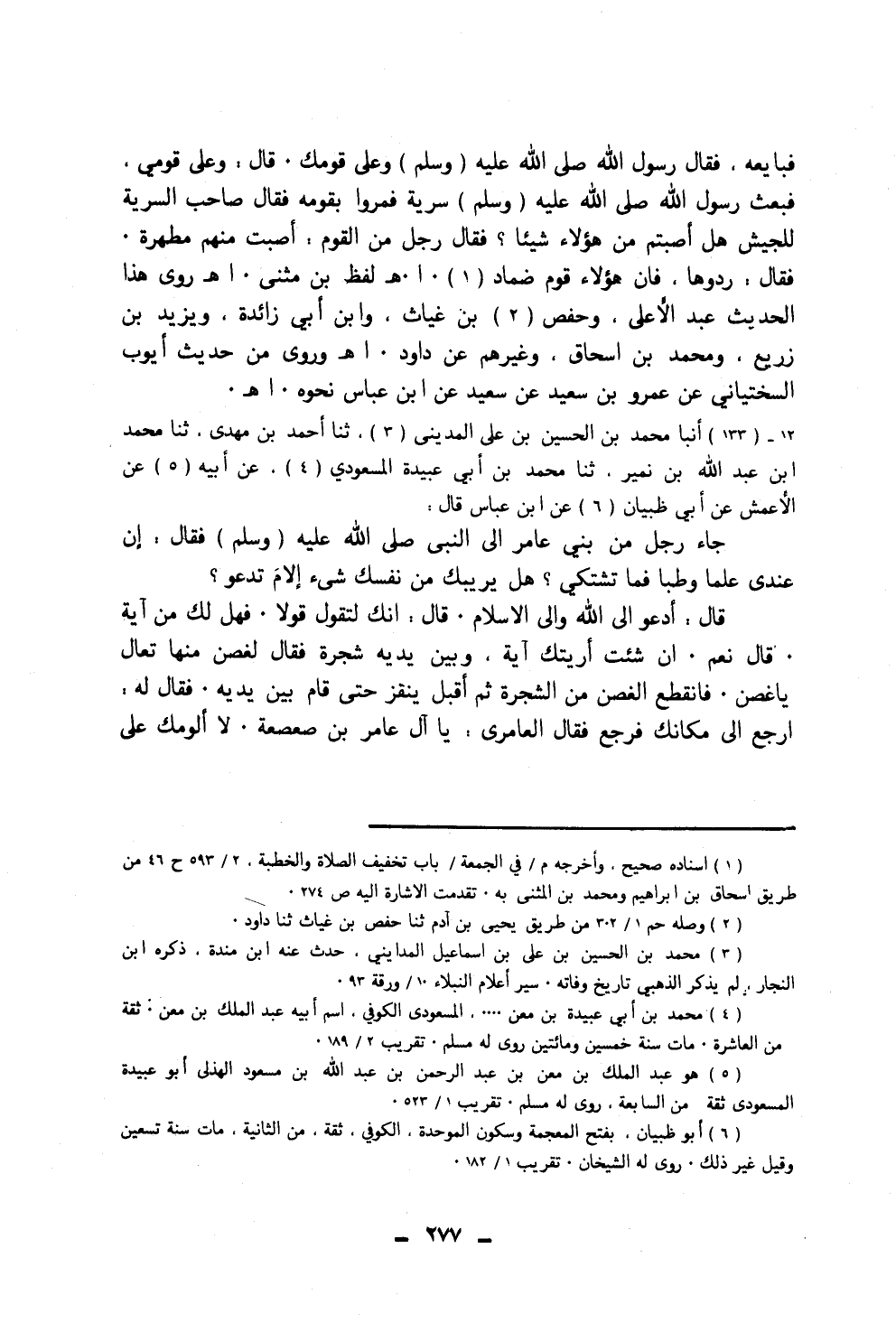 ١٣٣ - أَنْبَأَ مُحَمَّدُ بْنُ الْحُسَيْنِ بْنِ عَلِيٍّ الْمَدِينِيُّ، ثَنَا أَحْمَدُ بْنُ مَهْدِيٍّ، ثَنَا مُحَمَّدُ بْنُ عَبْدِ اللَّهِ بْنِ نُمَيْرٍ، ثَنَا مُحَمَّدُ بْنُ أَبِي عُبَيْدَةَ الْمَسْعُودِيُّ، عَنْ أَبِيهِ، عَنِ الْأَعْمَشِ، عَنْ أَبِي ظَبْيَانَ، عَنِ ابْنِ عَبَّاسٍ، قَالَ: جَاءَ رَجُلٌ مِنْ بَنِي عَامِرٍ إِلَى النَّبِيِّ صَلَّى اللهُ عَلَيْهِ وَسَلَّمَ، فَقَالَ: إِنَّ عِنْدِي عِلْمًا وَطِبًّا فَمَا تَشْتَكِي؟، هَلْ يَرِيبُكَ مِنْ نَفْسِكَ شَيْءٌ؟، إِلَامَ تَدْعُو؟، قَالَ: «أَدْعُو إِلَى اللَّهِ وَإِلَى الْإِسْلَامِ» ، قَالَ: إِنَّكَ لَتَقُولُ قَوْلًا فَهَلْ لَكَ مِنْ آيَةٍ، قَالَ: «نَعَمْ إِنْ شِئْتَ أُرِيتُكَ آيَةً» ، وَبَيْنَ يَدَيْهِ شَجَرَةٌ، فَقَالَ لِغُصْنٍ مِنْهَا: «تَعَالَ يَا غُصْنُ» ، فَانْقَطَعَ الْغُصْنُ مِنَ الشَّجَرَةِ، ثُمَّ أَقْبَلَ يَنْفِزُ حَتَّى قَامَ بَيْنَ يَدَيْهِ، فَقَالَ لَهُ: «ارْجِعْ إِلَى مَكَانِكَ» ، فَرَجَعَ، فَقَالَ الْعَامِرِيُّ: يَا آلَ عَامِرِ بْنِ صَعْصَعَةَ لَا أَلُومُكَ عَلَى ⦗٢٧٨⦘ شَيْءٍ قُلْتَهُ أَبَدًا. رَوَاهُ أَبُو مُعَاوِيَةَ. وَقَالَ عَبْدُ الْوَاحِدِ بْنُ زِيَادٍ، عَنِ الْأَعْمَشِ، عَنْ سَالِمِ بْنِ أَبِي الْجَعْدِ، عَنِ ابْنِ عَبَّاسٍ. «وَحَدِيثُ أَبِي ظَبْيَانَ أَوْلَى» . رَوَاهُ شَرِيكٌ، عَنْ سِمَاكٍ، عَنْ أَبِي ظَبْيَانَ. ثَنَا مُحَمَّدُ بْنُ أَيُّوبَ، أَنْبَأَ حَفْصُ بْنُ عُمَرَ، ثَنَا عَلِيٌّ نَحْوَهُ