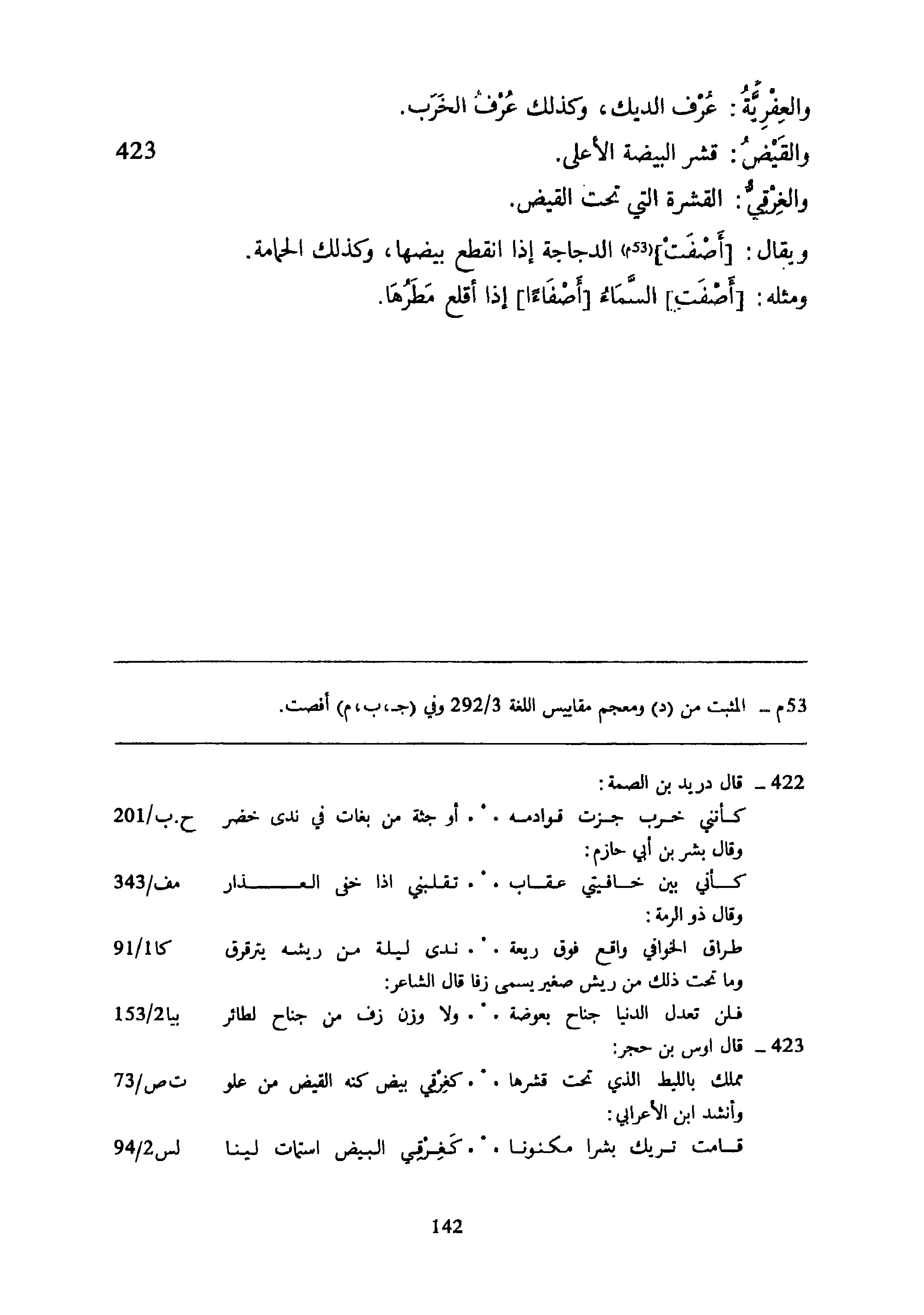 وَيُقَال: (أصفت) الدَّجَاجَة إِذا انْقَطع بيضها، وَكَذَلِكَ الْحَمَامَة.