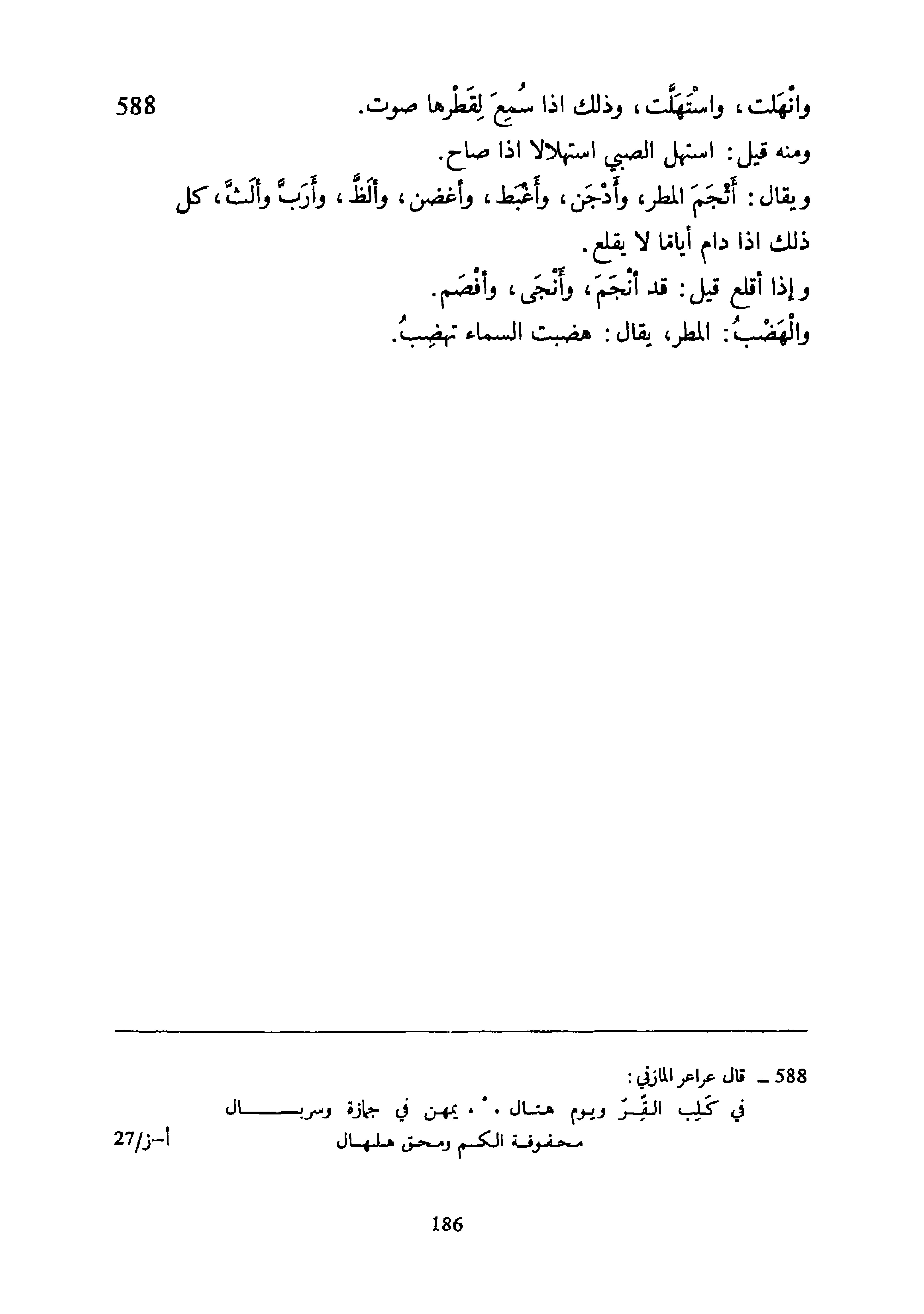 وَيُقَال: أتجم الْمَطَر وأدجن، وأغبط، وأغضن، وألظ، وأرب، وألث، كل ذَلِك إِذا دَامَ أَيَّامًا لَا يقْلع.