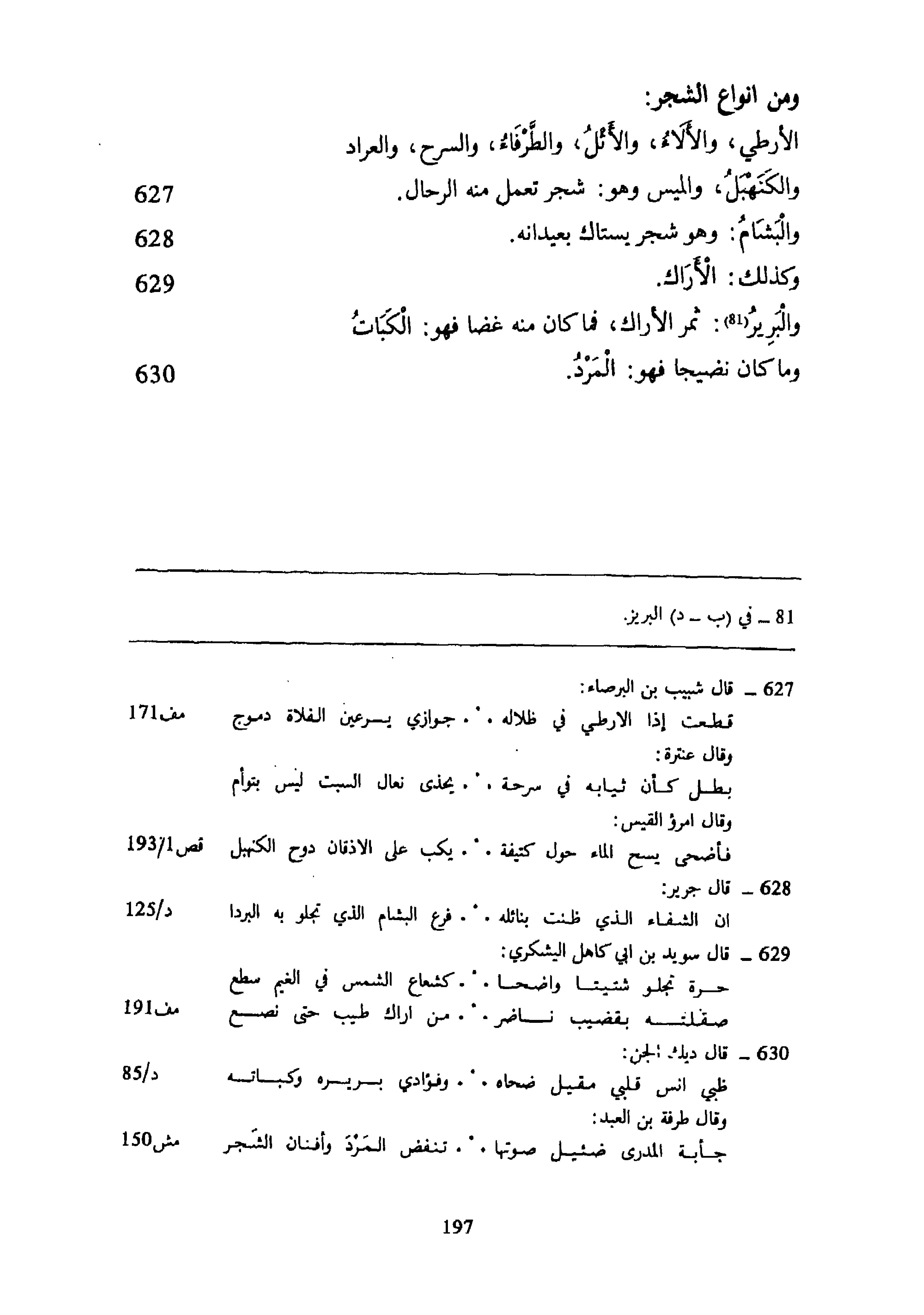 والبرير: ثَمَر الْأَرَاك، فَمَا كَانَ مِنْهُ غضا فَهُوَ: الكبات وَمَا كَانَ نضيجا فَهُوَ: المرد.