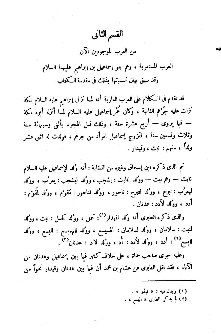 من العرب الموجودين الآن العرب المستعربة، وهم بنو إسماعيل بن إبراهيم عليهما السلام وقد سبق بيان تسميتها بذلك في مقدمة الكتاب قد تقدم في الكلام على العرب العاربة أنه لما نزل إبراهيم عليه السلام بمكة نزلت عليه جُرْهم الثانية، وكان عمر إسماعيل عليه السلام لما أنزله أبوه مكة - فيما يروى - أربع عشرة سنة، وذلك قبل الهجرة بألفي وسبعمائة سنة وثلاث وتسعين سنة، فتزوج إسماعيل امرأة من جرهم، فولدت له اثني عشر ولداً، منهم: نبت، وقيدار.