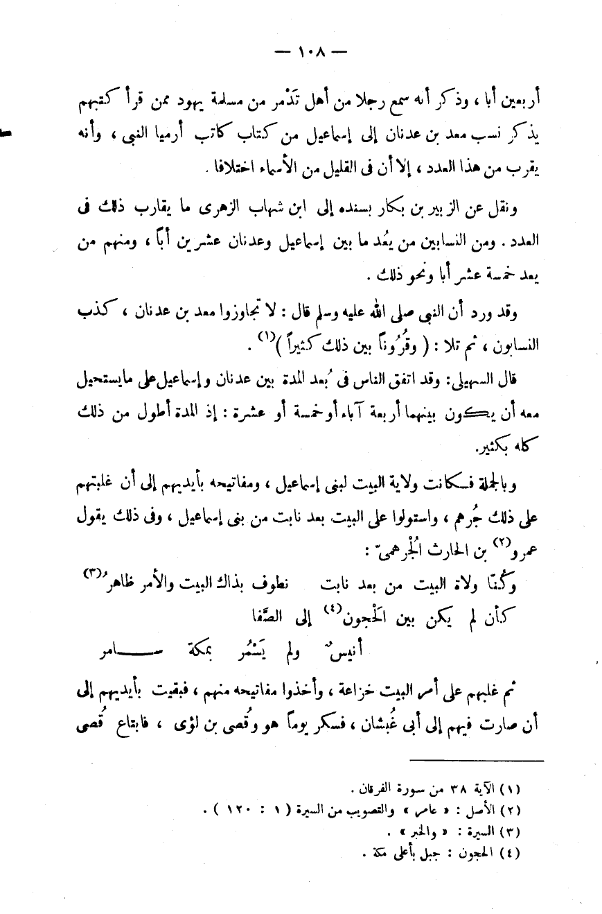 أربعين أباً، وذكر أنه سمع رجلاً من أهل تدمر من مسلمة يهود ممن قرأ كتبهم يذكر نسب معد بن عدنان إلى إسماعيل من كتاب كاتب أرميا النبي، وأنه يقرب من هذا العدد، إلا أن في القليل من الأسماء اختلافاً.