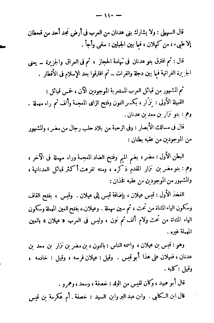 قال في مسالك الأبصار: وفي الرحبة من بلاد حلب رجال من مضر، والمشهور من الموجودين من عقبه بطنان: البطن الأول: مضر، بضم الميم وفتح الضاد المعجمة وراء مهملة في الآخر، وهم: بنو مضر بن نزار المقدم ذكره، ومنه تفرعت أكثر قبائل العدنانية، والمشهور من الموجودين من عقبه فخذان: الفخذ الأول: قيس عيلان، بإضافة قيس إلى عيلان. وقيس، بفتح القاف وسكون الياء المثناة من تحت، ثم سين مهملة. وعيلان، بفتح العين المهملة وسكون الياء المثناة من تحت ولام ألف ثم نون، وليس في العرب " عيلان " بالعين المهملة غيره.