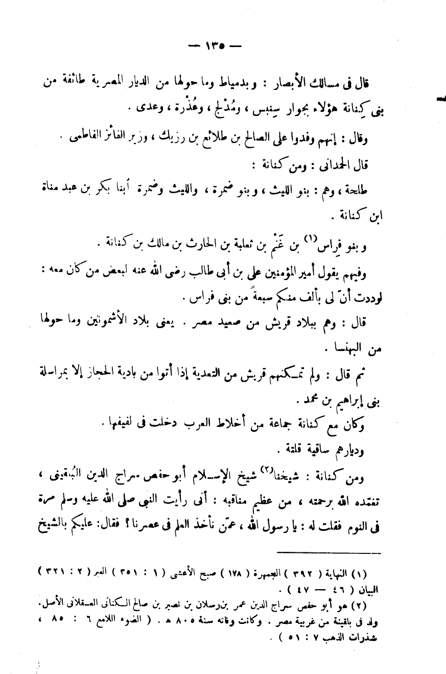 ومن كنانة: شيخنا شيخ الإسلام أبو حفص سراج الدين البُلقيني، تغمّده الله برحمته، من عظيم مناقبه: أني رأيت رسول الله صَلَّى اللهُ عَلَيْهِ وَسَلَّمَ مرة في النوم فقلت له: يا رسول الله، عمّن نأخذ العلم في عصرنا؟ فقال: عليكم بالشيخ