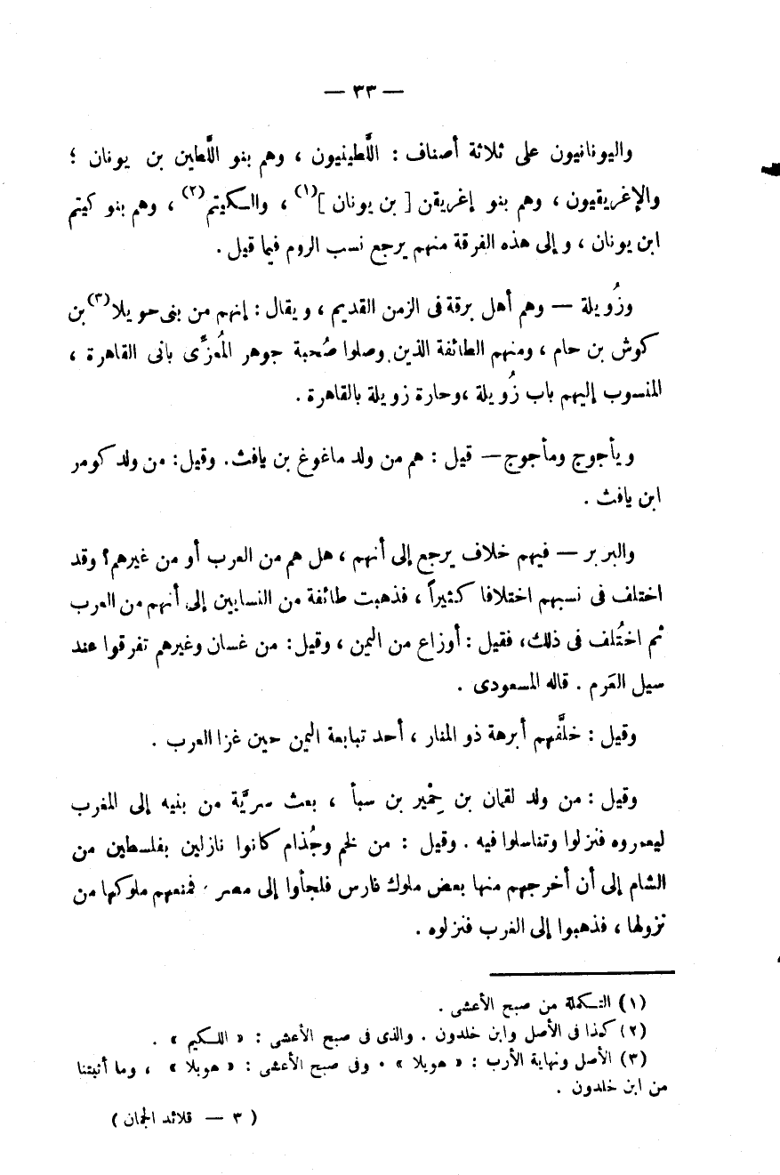 واليونانيون على ثلاثة أصناف: الَّلطينيون، وهم بنو الَّلطين بن يونان؛ والإغريقيون، وهم بنو إغريقن بن يونان، والكيتم، وهم بنو كيتم ابن يونان، وإلى هذه الفرقة منهم يرجع نسب الروم فيما قبل.