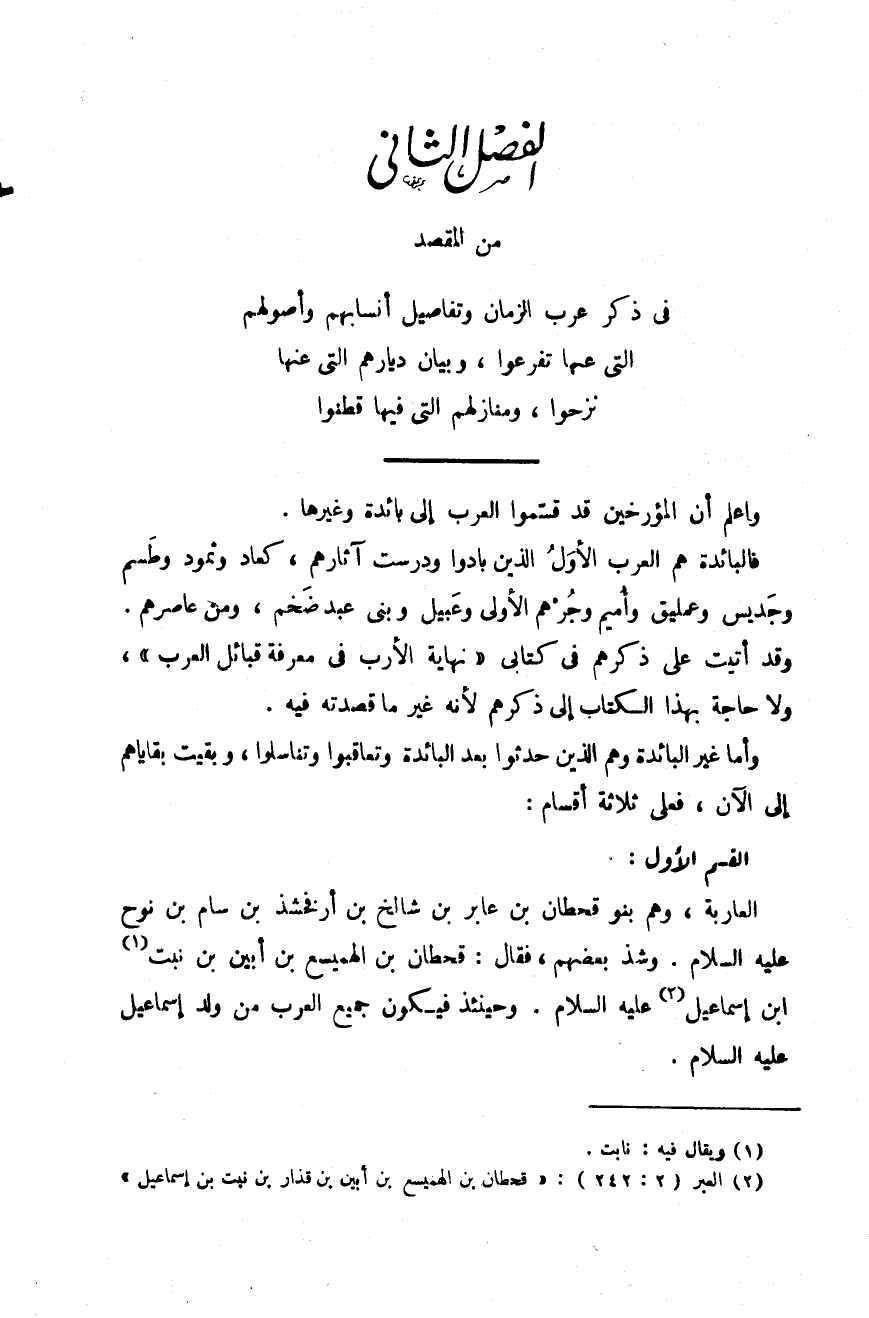التي عنها تفرعوا، وبيان ديارهم التي عنها نزحوا، ومنازلهم التي فيها قطنوا واعلم أن المؤرخين قد قسموا العرب إلى بائدة وغيرها.