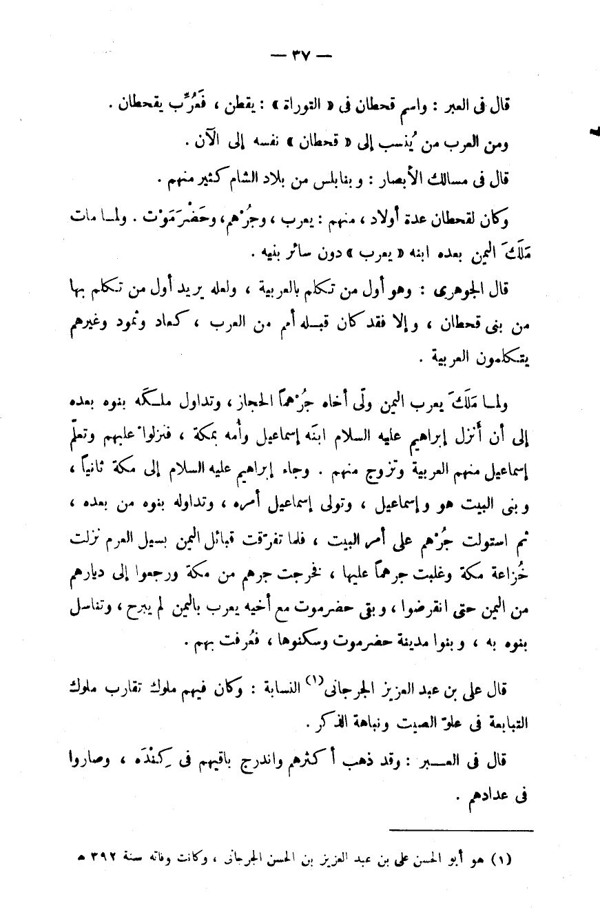 قال في العبر: واسم قحطان في " التوراة ": يقطن، فعُرِّب بقحطان.