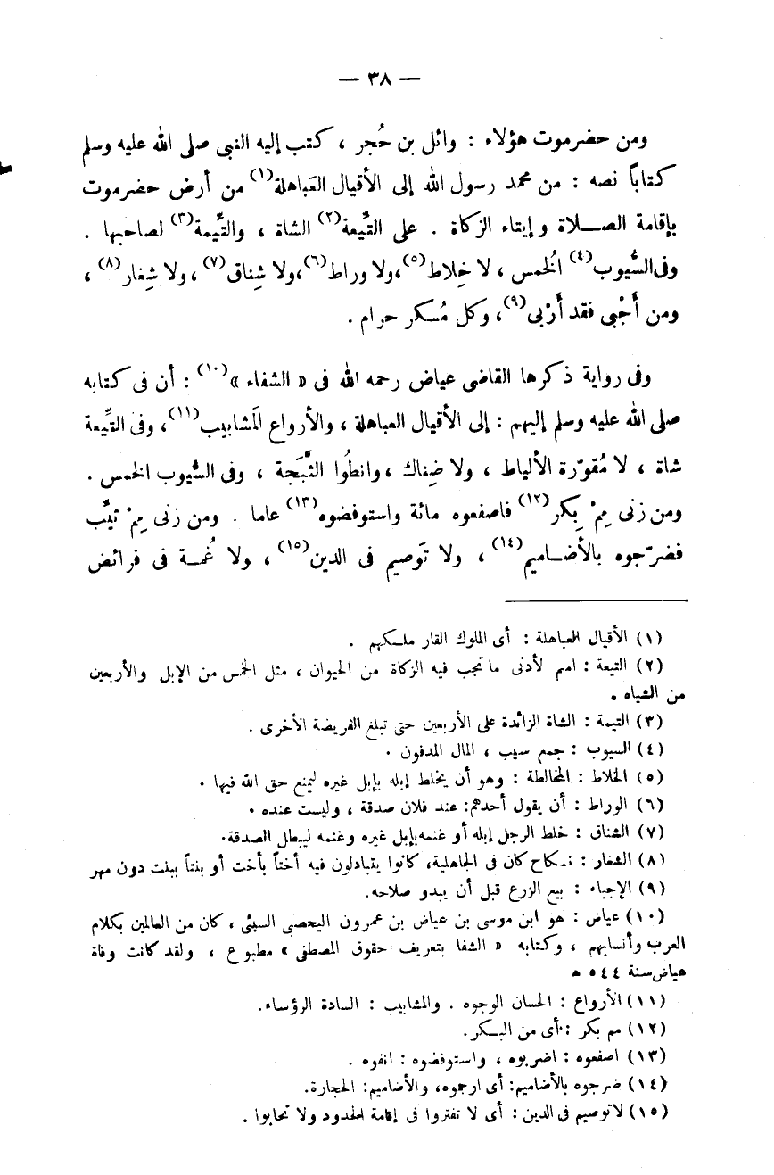 ومن حضرموت هؤلاء: وائل بن حُجر، كتب إليه النبي صَلَّى اللهُ عَلَيْهِ وَسَلَّمَ كتاباً نصه: من محمد رسول الله إلى الأقيال العباهلة من أرض حضرموت بإقامة الصلاة وإيتاء الزكاة. على التِّيعة الشاة، والتِّيمة لصاحبها. وفي السيوف الخُمس، ولا خِلاط، ولا وراط، ولا شِناق، ولا شِغار، ومن أجْبى فقد أربى، وكل مسكر حرام.
