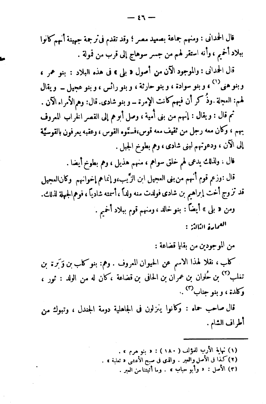 قال الحمداني: والموجود الآن من أصول " بليّ " في هذه البلاد: بنو عمر، وبنو هني، وبنو سوادة، وبنو حارثة، وبنو رائس، وبنو عجيل - ويقال لهم: العجلة. وذُكر أن فيهم كانت الإمرة - وبنو شادي. قال: وهم الأمراء الآن.