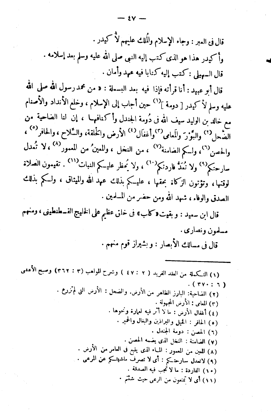 قال أبو عبيد: أنا قرأته فإذا فيه بعد البسملة: " من محمد رسول الله صَلَّى اللهُ عَلَيْهِ وَسَلَّمَ لأكيدر دومة حين أجاب إلى الإسلام، وخلع الأنداد والأصنام مع خالد بن الوليد سيف الله في دُومة الجندل وأكنافها، أن لنا الضاحية من الضَّحل والبَّوْرَ والمَعامي وأغفَال الأرض والحَلقة، والسِّلاح، والحافر، والحصن، ولكم الضامنة، من النخل، والمعين من المعمور، لا تعدل سارحتكم ولا تُعَدُّ فاردتكم، ولا يُحظر عليكم النبات. تقيمون الصلاة لوقتها، وتؤتون الزكاة بحقها، عليكم بذلك عهد الله والميثاق، ولكم بذلك الصدق والوفاء، شهد الله ومن حضر من المسلمين.
