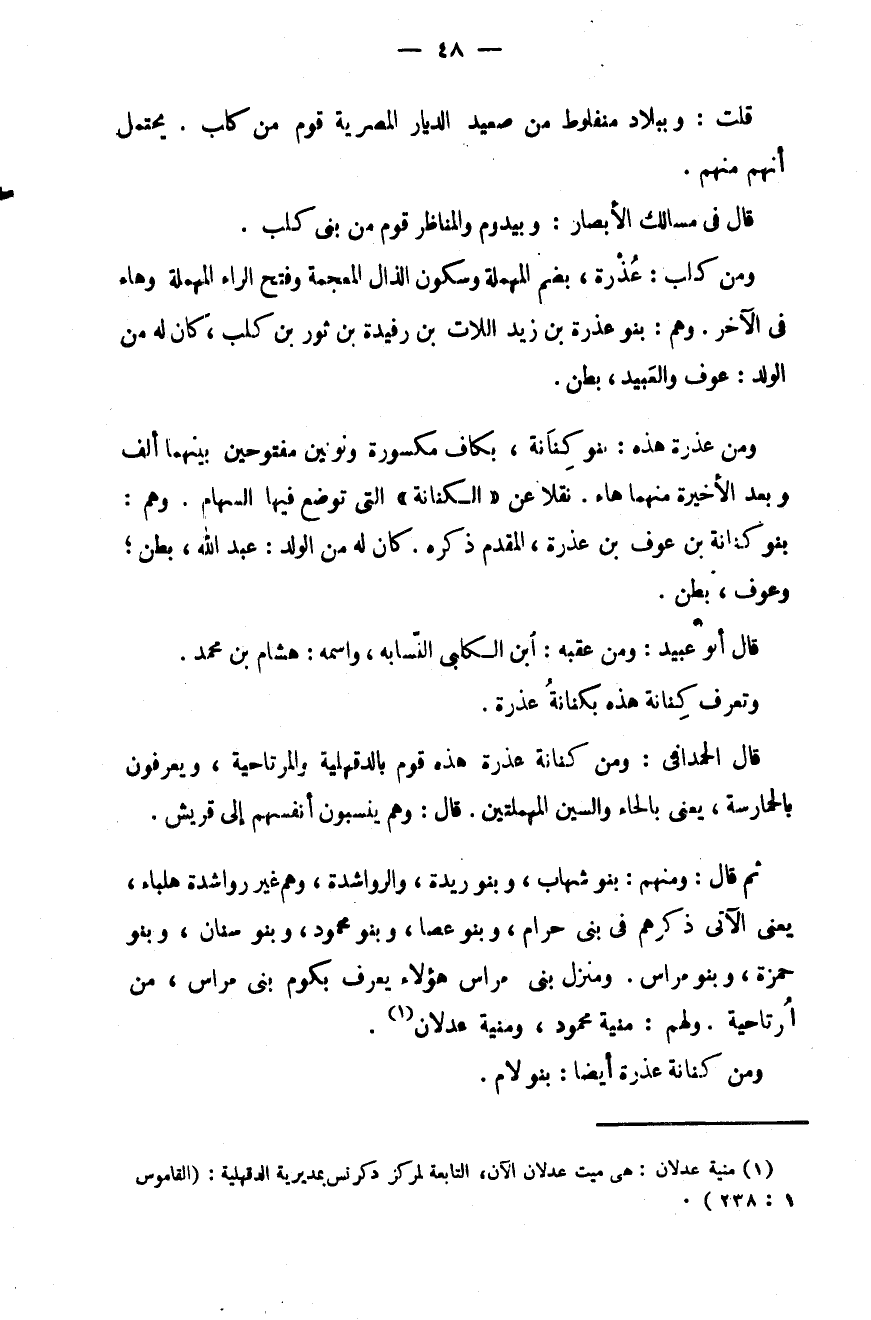 قال الحمداني: ومن كنانة عذرة هذه بالدقهلية والمرتاحية، ويعرفون بالحمارسة، يعني بالحاء والسين المهملتين. قال: وهم ينسبون أنفسهم إلى قريش.