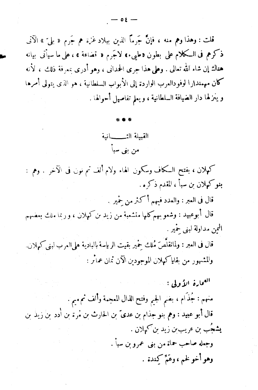 قال في العبر: ولما تقلَّص مُلك حِمير بقيت الرياسة بالبادية على العرب لبني كهلان. والمشهور من بقايا كهلان الموجودين الآن ثمان عمائر: