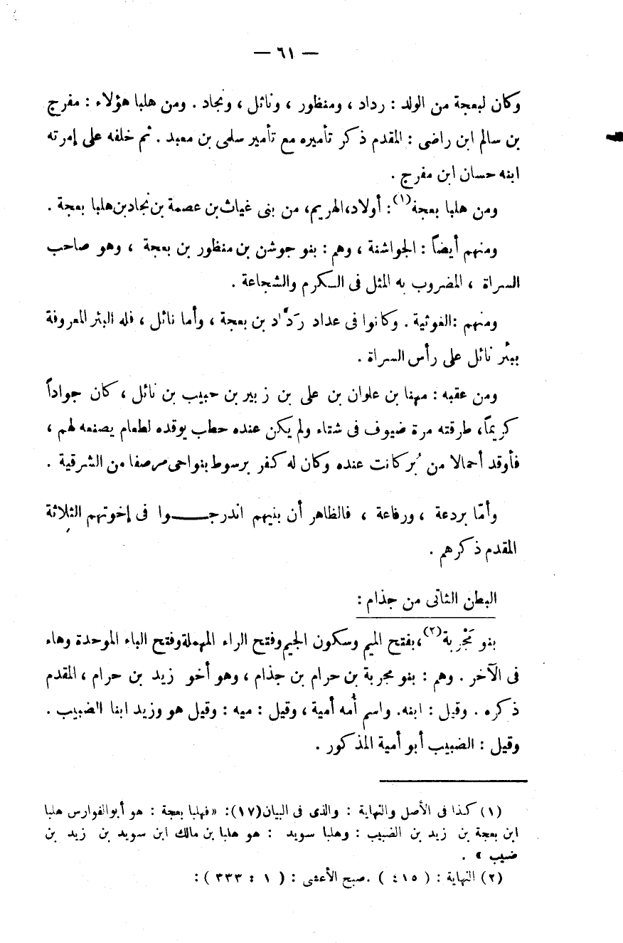 وكان لبعجة من الولد: رداد، ومنظور، وناثل، ونجاد. ومن هلبا هؤلاء: مفرجبن سالم ابن راضي: المقدم ذكر تأميره مع تأمير سلمى بن معبد. ثم خلفه على إمرته ابنه حسان ابن مفرج.