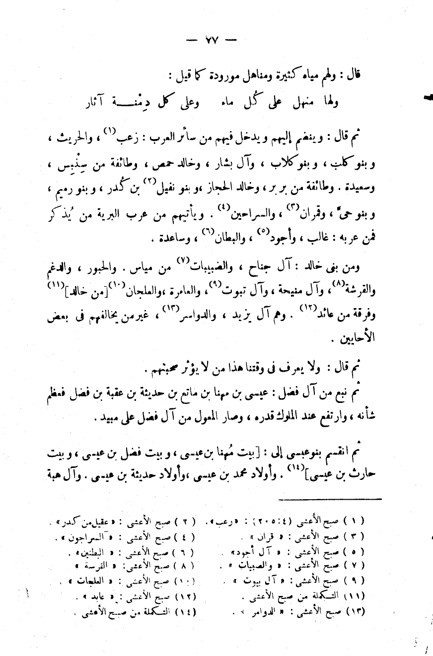 ثم قال: وينضم إليهم ويدخل فيهم من سائر العرب: زعب، والحريث، وبنو كلب، وبنو كلاب، وآل بشار، وخالد حمص، وطائفة من سِنْبِس، وسعيدة. وطائفة من بربر، وخالد الحجاز، وبنو نفيل بن كُدر، وبنو رميم، وبنو حيّ، وقمران، والسراحين. ويأتيهم من عرب البرية من يُذكر فمن عربه: غالب، وأجود، والبطان، وساعدة.
