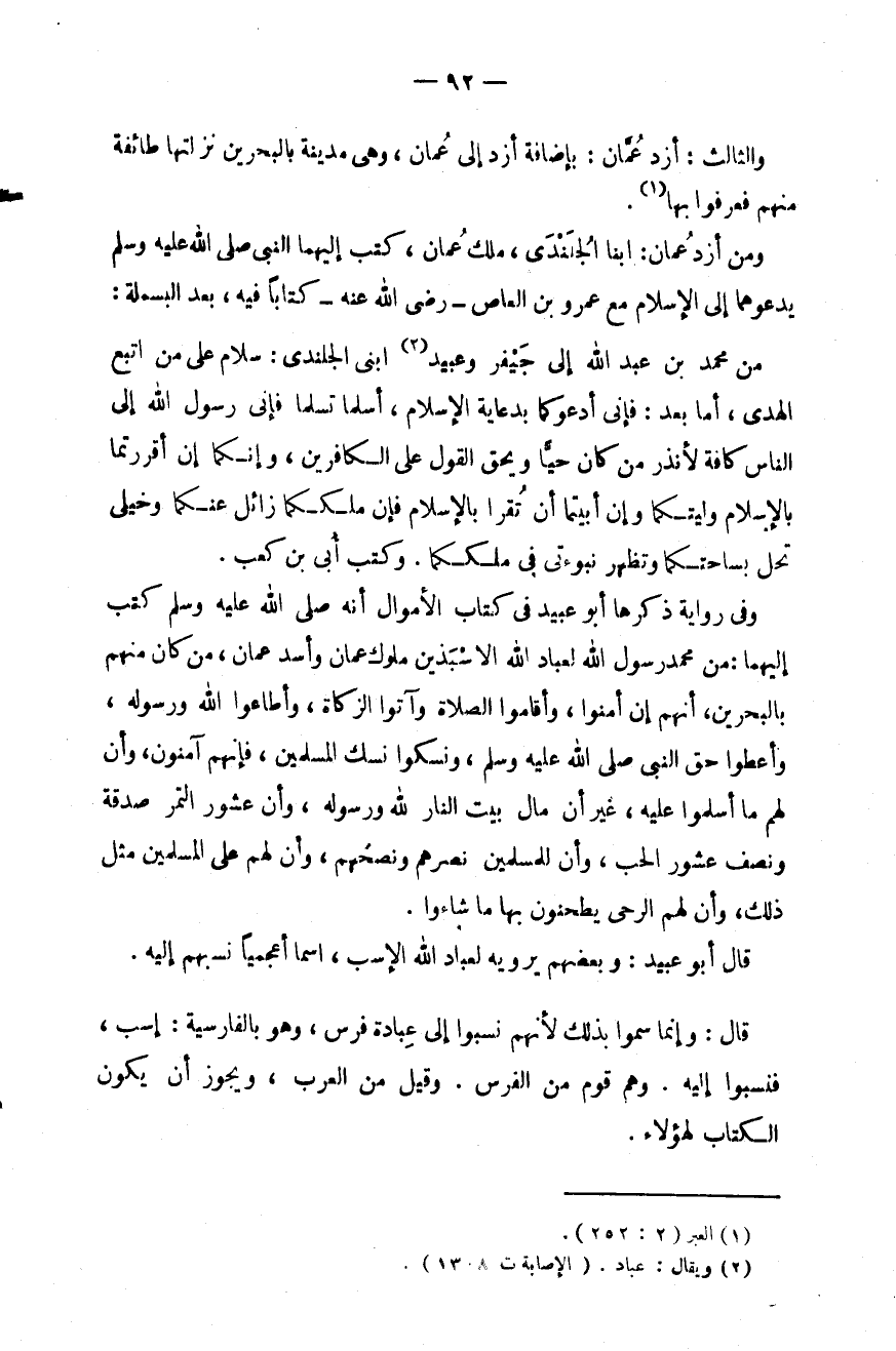 ومن أزد عمان: ابنا الجُلَنْدَي، ملك عمان، كتب إليهما النبي صَلَّى اللهُ عَلَيْهِ وَسَلَّمَ يدعوهما إلى الإسلام مع عمرو بن العاص - رضي الله عنه - كتاباً فيه، بعد البسملة: من محمد بن عبد الله إلى جَيْفر وعبيد ابني الجلندي: سلام على من اتبع الهدى، أما بعد: فإني أدعوكما بدعاية الإسلام، أسلما تسلما فإني رسول الله إلى الناس كافة لأنذر من كان حياً ويحق القول على الكافرين، وإنكما إن أقررتما بالإسلام وليتكما وإن أبيتما أن تُقرا بالإسلام فإن ملككما زائل عنكما وخيلي تحل بساحتكما وتظهر نبوءتي في ملككما. وكتب أُبي بن كعب.