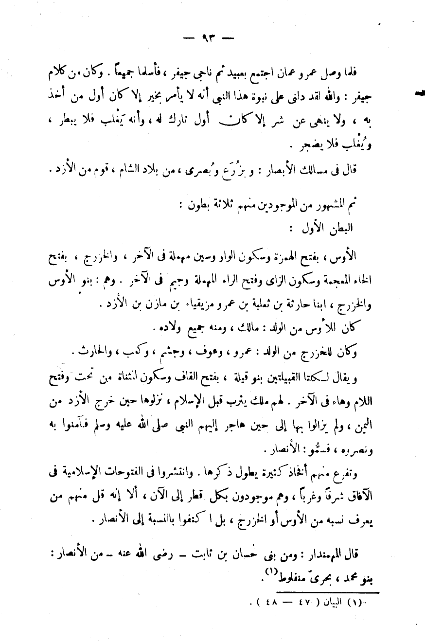 فلما وصل عمرو عمان اجتمع بعبيد ثم ناجي جيفر، فأسلما جميعاً. وكان من كلام جيفر: والله لقد دلني على نبوة هذا النبي أنه لا يأمر بخير إلا كان أول من أخذ به، ولا ينهي عن شر إلا كان أول تارك له، وأنه يَغْلب فلا يبطر، ويُغْلب فلا يضجر.