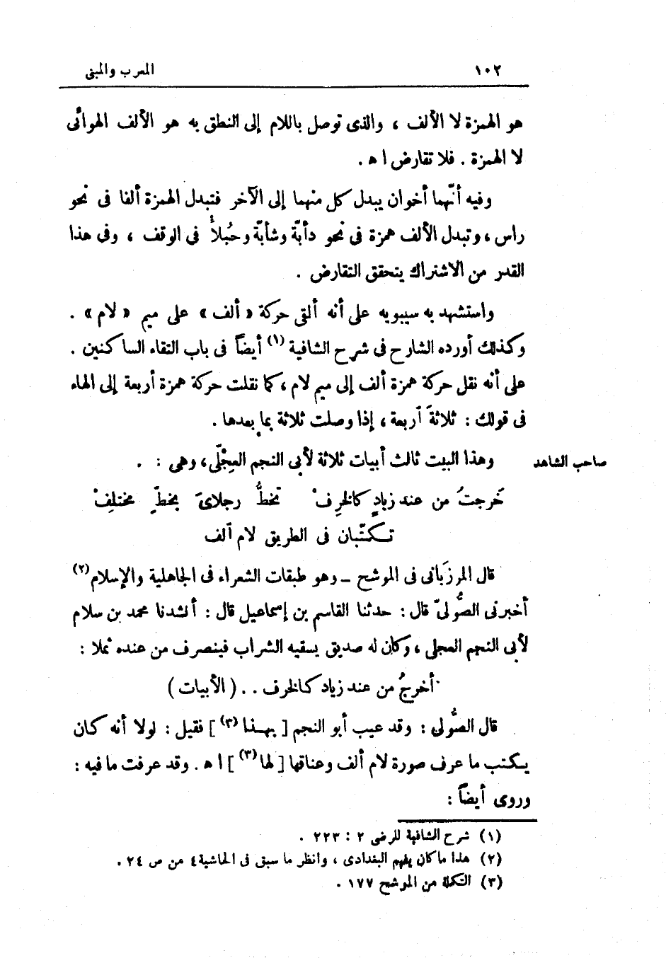 وَفِيه أَنَّهُمَا أَخَوان يُبدل كل مِنْهُمَا إِلَى الآخر فتبدل الْهمزَة ألفا فِي نَحْو رَأس وتبدل الْألف همزَة فِي نَحْو دأبة وشأبة وحبلأ فِي الْوَقْف وَفِي هَذَا الْقدر من الِاشْتِرَاك يتَحَقَّق التقارض وَاسْتشْهدَ بِهِ سِيبَوَيْهٍ على أَنه ألْقى حَرَكَة ألف على مِيم لَام وَكَذَلِكَ أوردهُ الشَّارِح فِي شرح الشافية أَيْضا فِي بَاب التقاء الساكنين على أَنه نقل حَرَكَة همزَة ألف إِلَى مِيم لَام كَمَا نقلت حَرَكَة همزَة أَرْبَعَة إِلَى الْهَاء فِي قَوْلك ثَلَاثَة أَرْبَعَة إِذا صلت ثَلَاثَة بِمَا بعْدهَا وَهَذَا الْبَيْت ثَالِث أَبْيَات ثَلَاثَة لأبي النَّجْم الْعجلِيّ وَهِي (الرجز)