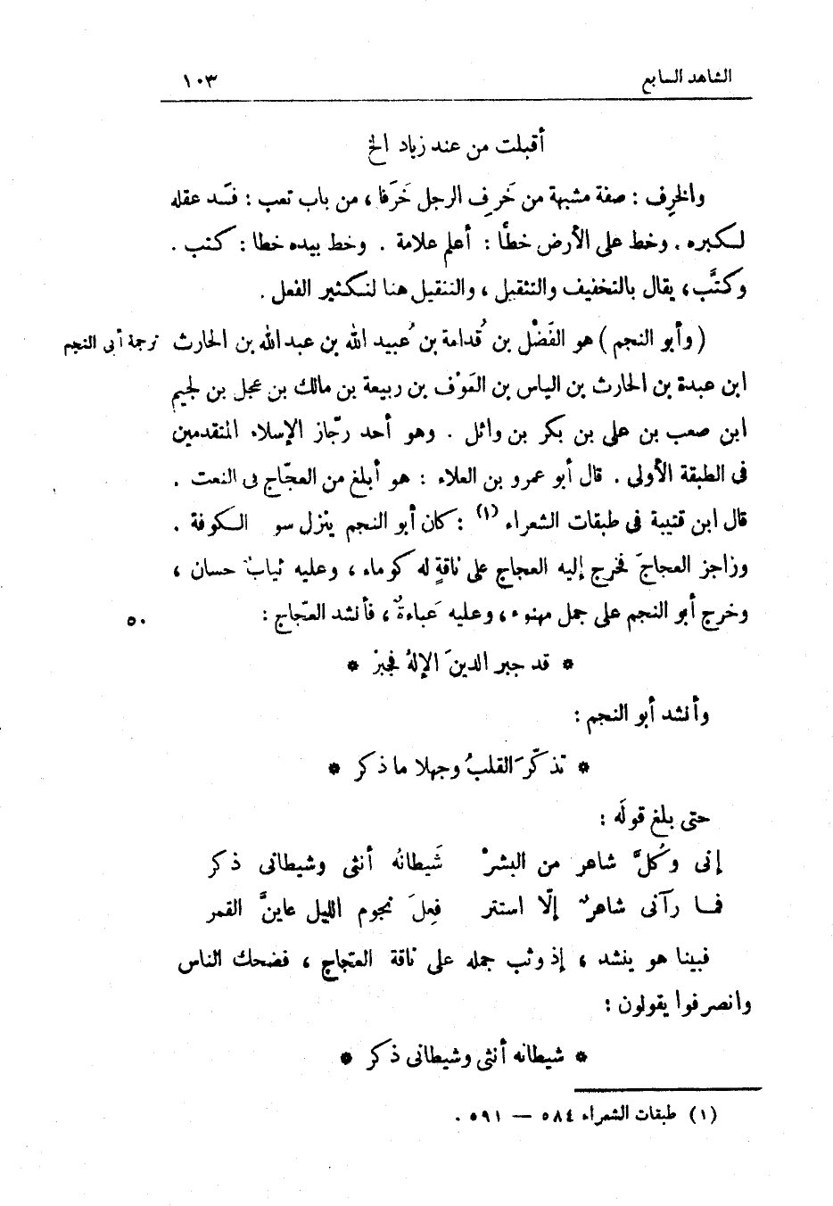 والخرف صفة مشبهة من خرف الرجل خرفا من بَاب تَعب فسد عقله لكبره وَخط على الأَرْض خطا أعلم عَلامَة وَخط بِيَدِهِ خطا كتب وَكتب يُقَال بِالتَّخْفِيفِ والتثقيل والتثقيل هُنَا لتكثير الْفِعْل وَأَبُو النَّجْم هُوَ الْفضل بن قدامَة بن عبيد الله بن عبد الله بن الْحَارِث ابْن عَبدة بن الْحَارِث بن الياس بن العوف بن ربيعَة بن مَالك بن عجل بن لجيم بن صَعب بن عَليّ بن بكر بن وَائِل وَهُوَ أحد رجاز الْإِسْلَام الْمُتَقَدِّمين فِي الطَّبَقَة الأولى قَالَ أَبُو عَمْرو بن الْعَلَاء هُوَ أبلغ من العجاج فِي النَّعْت قَالَ ابْن قُتَيْبَة فِي طَبَقَات الشُّعَرَاء كَانَ أَبُو النَّجْم ينزل سوق الْكُوفَة وراجز العجاج فَخرج إِلَيْهِ العجاج على نَاقَة لَهُ كوماء وَعَلِيهِ ثِيَاب حسان وَخرج أَبُو النَّجْم على جمل مهنوء وَعَلِيهِ عباءة فَأَنْشد العجاج (الرجز)
