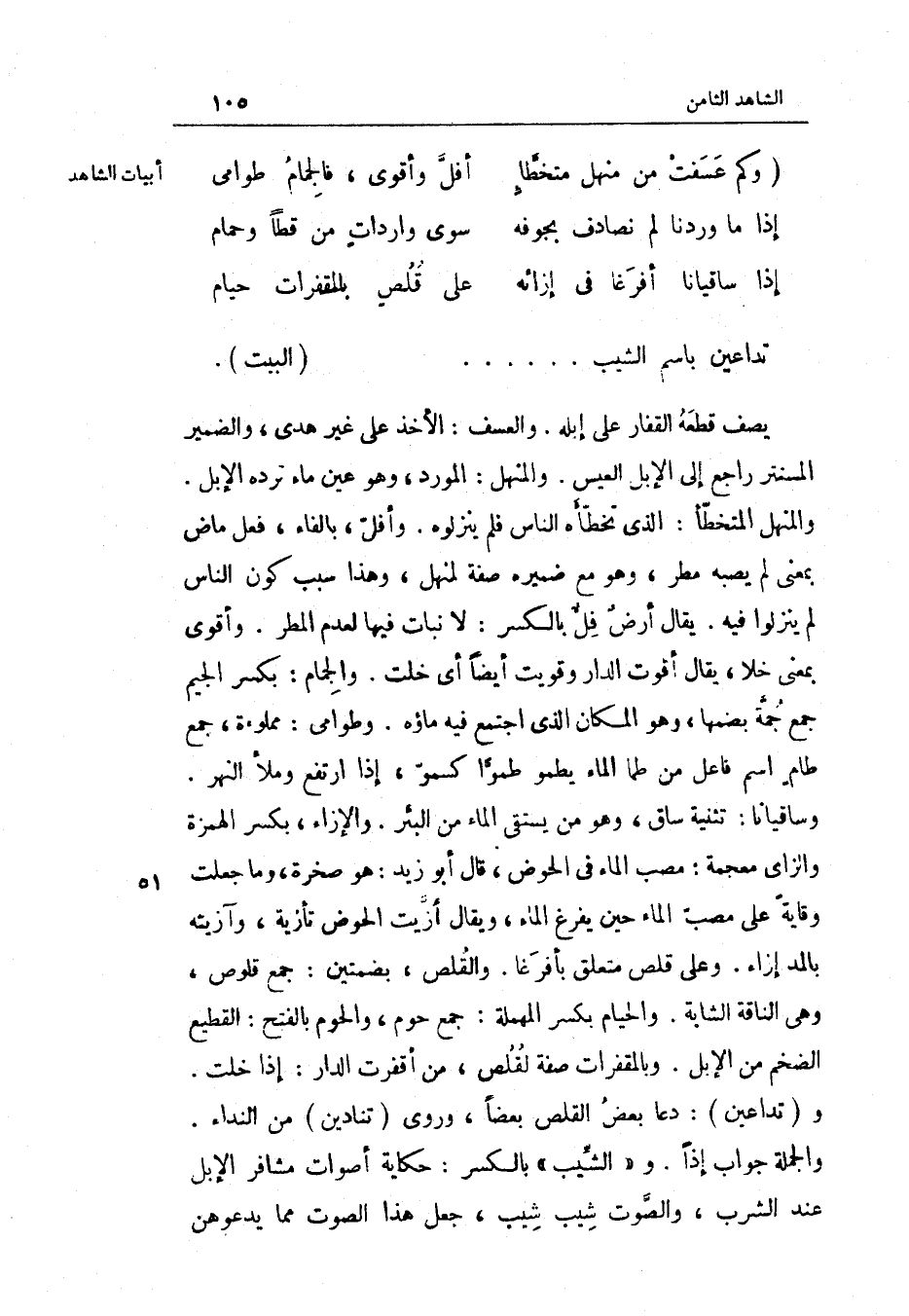 يصف قطعه القفار على إبِله والعسف الْأَخْذ على غير هدى وَالضَّمِير الْمُسْتَتر رَاجع إِلَى الْإِبِل العيس والمنهل المورد وَهُوَ عين مَاء ترده الْإِبِل والمنهل المتخطأ الَّذِي تخطأه النَّاس فَلم ينزلوه وأفل بِالْفَاءِ فعل مَاض بِمَعْنى لم يصبهُ مطر وَهُوَ مَعَ ضميرَة صفة لمنهل وَهَذَا سَبَب كَون النَّاس لم ينزلُوا فِيهِ يُقَال أَرض فل بِالْكَسْرِ لَا نَبَات فِيهَا لعدم الْمَطَر وَأقوى بِمَعْنى خلا يُقَال أقوت الدَّار وقويت أَيْضا أَي خلت والجمام بِكَسْر الْجِيم جمع جمة بضَمهَا وَهُوَ الْمَكَان الَّذِي اجْتمع فِيهِ مَاؤُهُ وطوامي مَمْلُوءَة جمع طام اسْم فَاعل من طما المَاء يطمو طموا كسمو إِذا ارْتَفع وملأ النَّهر وساقيانا تَثْنِيَة سَاق وَهُوَ من يَسْتَقِي المَاء من الْبِئْر والإزاء بِكَسْر الْهمزَة وَالزَّاي مُعْجمَة مصب المَاء فِي الْحَوْض قَالَ أَبُو زيد هُوَ صَخْرَة وَمَا جعلت وقاية على مصب المَاء حِين يفرغ المَاء وَيُقَال أزيت الْحَوْض تأزية وآزيته بِالْمدِّ إزاء وعَلى قلص مُتَعَلق بأفرغا والقلص بِضَمَّتَيْنِ جمع قلُوص وَهِي النَّاقة الشَّابَّة والحيام بِكَسْر الْمُهْملَة جمع حوم والحوم بِالْفَتْح القطيع الضخم من الْإِبِل وب المقفرات صفة لقلص من أقفرت الدَّار إِذا خلت وتداعين دَعَا بعض القلص بَعْضًا وروى تنادين من النداء وَالْجُمْلَة جَوَاب إِذا والشيب بِالْكَسْرِ حِكَايَة أصوات مشافر الْإِبِل عِنْد الشّرْب وَالصَّوْت شيب شيب جعل هَذَا الصَّوْت مِمَّا يدعوهن